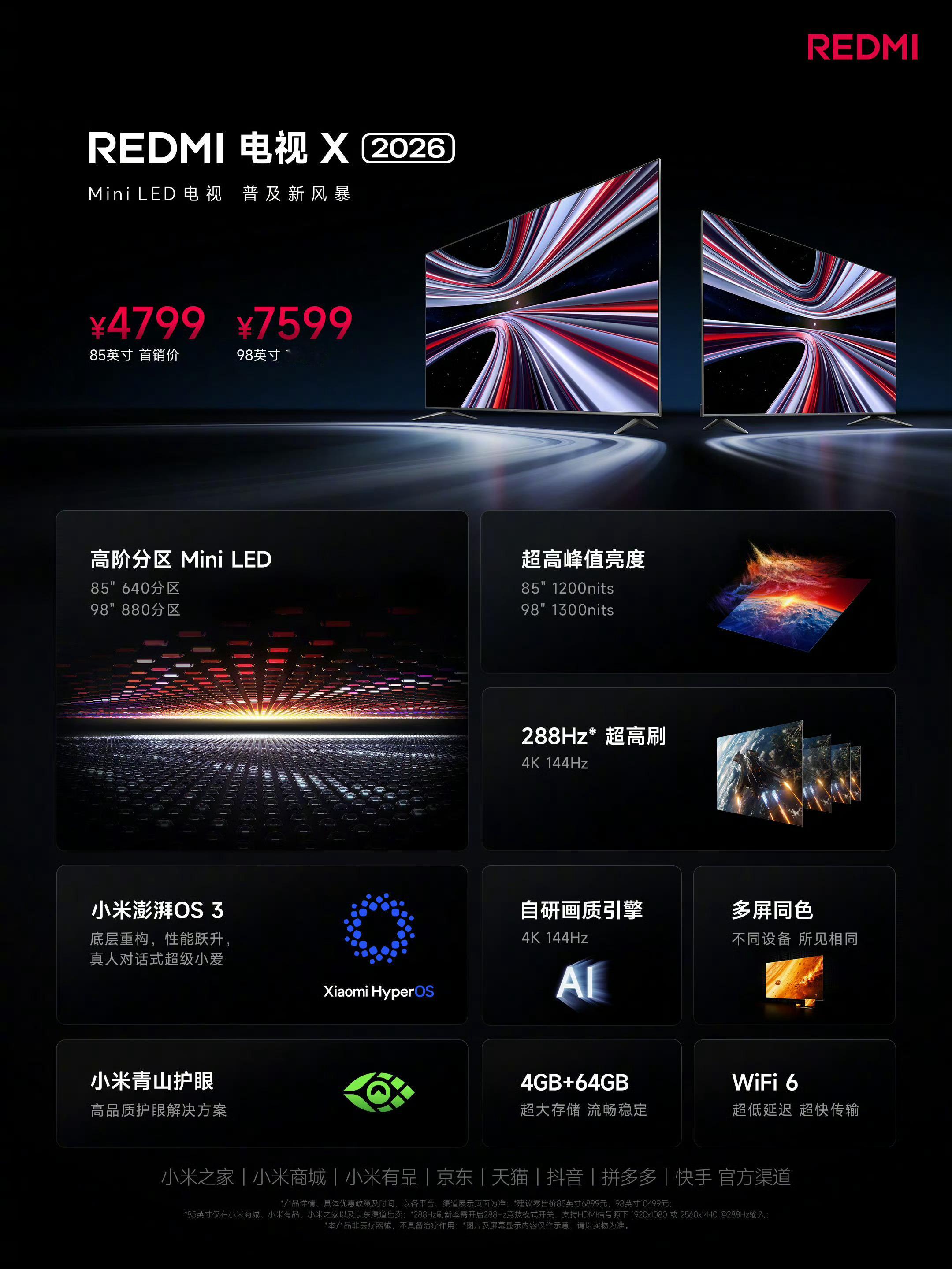 REDMI 电池 X 2026: 4799/7599,85寸/98寸,Mini LED。