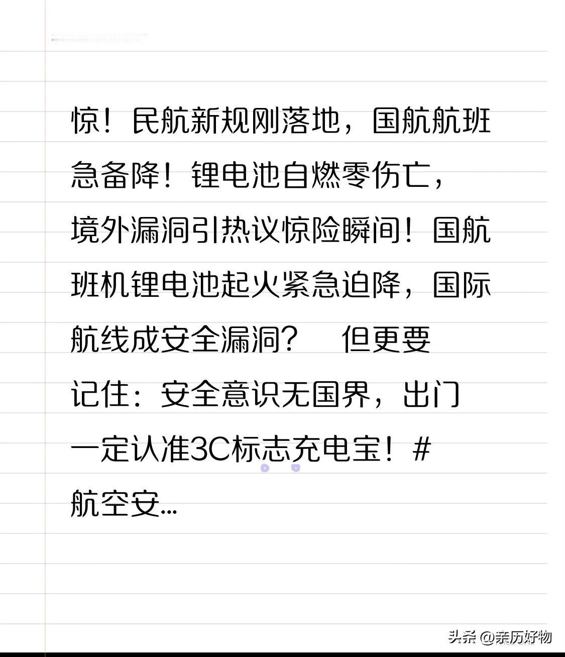 惊!民航新规刚落地,国航航班急备降!锂电池自燃零伤亡,境外漏洞引热议 惊险瞬间!国航班机锂电池起火紧急迫降,国际航线成安全漏洞?⚠️但更要记住:安全意识无国界,出门一定认准3C标志充电宝!航空安全 出行贴士 万米高空突发状况!国航机组冷静应对化险为夷,这份乘机安全攻略请收好✈️ 10月18日,国航CA139由杭州飞往韩国仁川途中,行李舱突然冒出大量烟雾!原因是一名乘客的锂电池意外自燃,空乘团队迅速启动应急预案,飞机紧急转降上海浦东机场,幸好全程无人受伤。 更让人放心的是,国航马上调派了新飞机继续执飞,旅客的行程几乎没被打乱。必须承认,经过专业培训的机组人员确实是空中安全的坚强后盾! 不过这件事也提醒我们:虽然民航局早在6月28日发布了新规定,禁止国内航班携带未经“3C”认证的充电宝,但国际航班目前还没实行同样要求。也就是说,乘坐出境航班时仍可能隐藏风险。 其实安全意识不分国内国外,出行时一定要选择带有3C认证标识的充电宝。安全无小事,一旦在万米高空发生意外,结果可能非常严重。 大家坐飞机时都经历过哪些突发情况?又是怎么处理的呢?快来分享一下你的飞行安全经验吧!航空安全 出行贴士 飞国外飞机起火 飞机安全事件 国航遇险 客舱起火