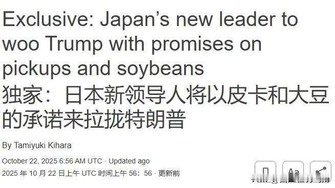 高市早苗上任后第一件事:中国不买的美国大豆,日本买了。估计特朗普很快就能为那些卖不出去的美国大豆,找到去处了。 新上任的日本首相高市早苗,把“讨好美国”的牌打得响亮。22日路透社的消息一出来,所有人都看明白了——她正赶着制定采购美国大豆、皮卡和天然气的计划,就等下周美日会晤时亲手递给特朗普。 这波操作,分明是想接下中方不买的美国大豆,给这位美国领导人送份“见面礼”。可日本真有能力当这个“接盘侠”吗?先看一组实打实的数据。日本市场93%以上的大豆都依赖进口,其中美国大豆已占去70%的份额,剩下的基本靠巴西填补。 为了给美国大豆腾地方,日本甚至要削减巴西大豆的采购量,这已经是在挤压现有供应链的空间。更关键的是,日本每年大豆进口量撑死了也就500万吨,常年维持在330万到500万吨之间,可美国到9月底积压的大豆就高达800万吨,这缺口可不是靠“挤一挤”就能补上的。 高市早苗的前任石破茂早就试过这条路,今年4月的美日贸易谈判中,日方也曾琢磨过用增加美国大豆进口当筹码,可最后压根没敢写进协议。这背后藏着的,正是日本市场需求的“天花板”。 大豆这东西不能当饭吃,主要用来榨油和做饲料,日本的食用油消费和养殖业规模就那么大,多出来的大豆买回去难道要堆在仓库里发霉?明眼人都看得出,这不是能力问题,是根本没必要。 那高市早苗为何非要硬着头皮上?答案藏在美日贸易的博弈里。2025年7月达成的美日贸易协议里,美国给日本架了把“刀”——对几乎所有日本进口产品征收15%的基准关税,汽车这类核心产业首当其冲。 作为交换,日本承诺每年买80亿美元美国农产品,还得向美国投资5500亿美元。高市早苗竞选时还骂这协议不公平,上任就立刻改口说要遵守,如今加码买大豆,不过是想在谈判桌上换点喘息空间。 更有意思的是特朗普的“软肋”。这位美国领导人最看重的,从来不是协议能不能兑现,而是有没有亮眼的数字能拿来宣传。之前日本承诺的5500亿美元投资,连日本教授都吐槽“投资内容由美国选”,可特朗普早拿着这个数字吹了无数次。 高市早苗显然摸透了这套路,先抛出采购计划让他高兴,至于后续能不能消化800万吨大豆,根本不是当下要考虑的事。这出“大豆戏”里,最委屈的当属巴西。 作为全球第二大农产品出口国,巴西常年和美国争夺日本市场,如今却要为美日的政治交易让路。可日本的小算盘也未必能打响,大豆进口不是买菜,供应链调整需要时间,突然削减巴西订单再加大美国采购,很可能引发价格波动,最后成本还得日本企业自己扛。 有日本粮商私下抱怨,这根本不是做生意,是在“为政治买单”。高市早苗的压力还不止于此。日本民众早就对给美国“送钱”怨声载道,之前5500亿美元投资承诺就遭一片反对。现在又要花钱买用不完的大豆,无疑会加重新的民生不满。 她一边要给美国送“礼物”,一边要应对国内经济难题,还要忙着修改安保文件增加防卫费,这“三管齐下”的压力,恐怕不是靠几船大豆就能缓解的。说到底,这场大豆交易就是场各取所需的政治表演。 美国要数字撑场面,日本要换贸易喘息空间,只有被牺牲的市场规律和民众利益成了背景板。高市早苗以为这是稳赚的买卖,却忘了“强买强卖”从来没有好结果。要是后续大豆积压导致产业受损,或是民众抗议声浪高涨,这份“见面礼”迟早会变成烫手山芋。 特朗普或许很快就能拿着日本的采购计划吹嘘“战绩”,可800万吨大豆的窟窿还在那摆着。高市早苗的讨好能不能换来想要的结果不好说,但这种把经济当政治筹码的做法,终究是捡了芝麻丢了西瓜。毕竟,靠“接盘”换不来真合作,只有尊重市场规律的交易,才能走得长远。