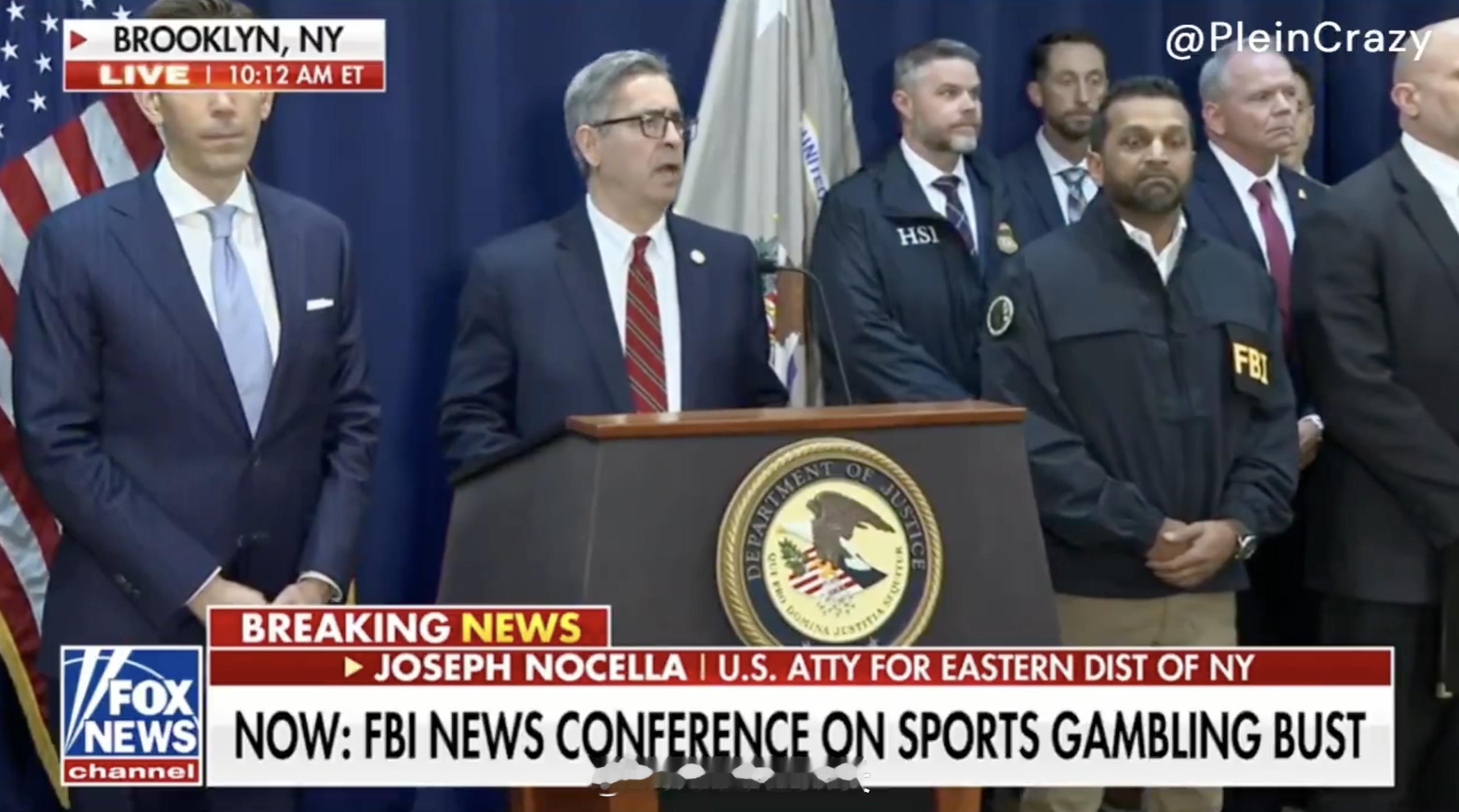 图2 图3是FBI召开本次事件的发布会现场,局长Kash Patel(图2)表示他们捣毁了一个大型非法赌博团伙,该团伙由 NBA 球员、教练和多个黑手党犯罪家族协作组成。此次行动横跨 11 个州,持续数年,迄今已逮捕 30 多人。指控包括操纵体育博彩、操纵扑克游戏、抢劫以及其他导致受害者损失数千万美元的犯罪行为。官员警告说,随着调查的继续,可能还会有更多人被捕。
