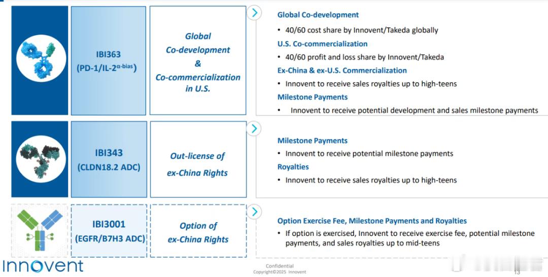 不同于传统BD交易,信达生物与武田制药的合作,涉及3个分子(IBI363、IBI343、IBI3001),且每一个分子的交易条款均各不相同。图:信达生物BD权益汇总,来源:公司官网