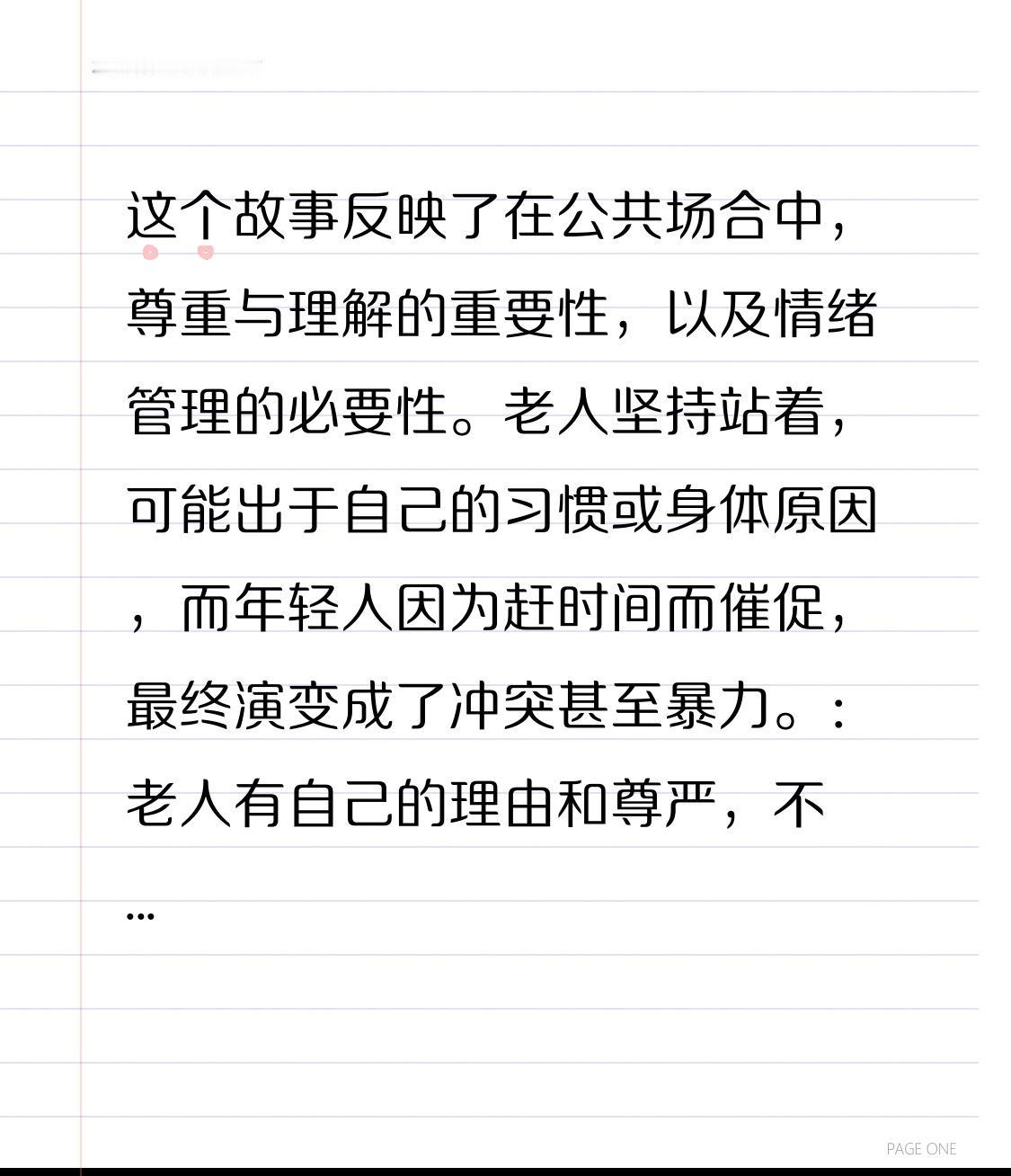 这个故事反映了在公共场合中,尊重与理解的重要性,以及情绪管理的必要性。老人坚持站着,可能出于自己的习惯或身体原因,而年轻人因为赶时间而催促:老人有自己的理由和尊严,不应轻易强迫他们做出改变。我们应以理解和耐心对待他们的行为。 面对不同的意见,平和的沟通比动手更能解决问题,也能维护社会的和谐。 冲动和暴力只会带来更多伤害,应学会控制情绪,用理性处理矛盾。 每个人都应遵守公共秩序,尊重他人权益,共同营造安全、文明的环境。 这个故事也提醒我们,每个人都应反思自己的行为,学会包容与理解,避免因小事引发不必要的冲突。照顾他人情绪