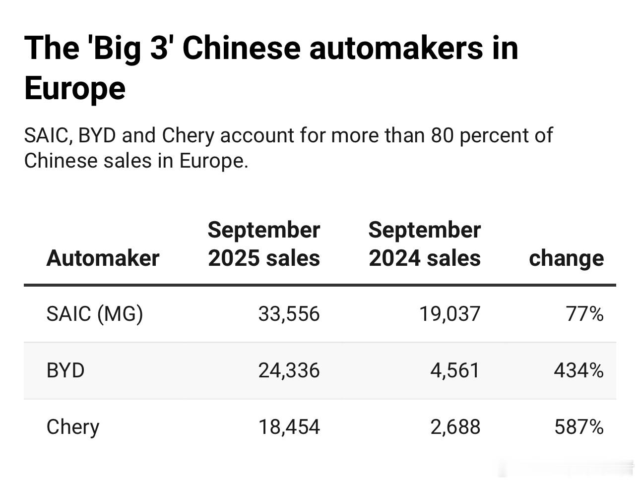 九月份欧洲汽车市场增长了11%,销量为1,217,123台,而中国车企销量增长了149%,达到了90,571 台,市场份额再创新高,达到了7.4%,而去年同期只有3.3%。