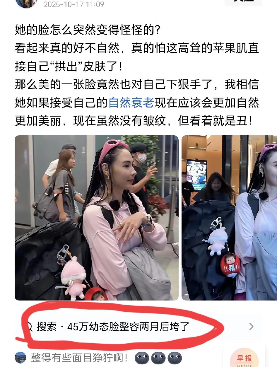 Ai是懂阴阳怪气的[偷笑],在张女士变脸的内容下,它提示大家“45万幼态脸整容两月后垮了”……[我想静静],害我笑出猪叫声[偷笑]。 幼态脸离不了饱满、圆润,但人工打造的饱满通常存在一个问题:过度饱满,用力过猛。 建议可以问问林志玲用的哪个执行者,林志玲很少失手,偶尔会轻微过度饱满……