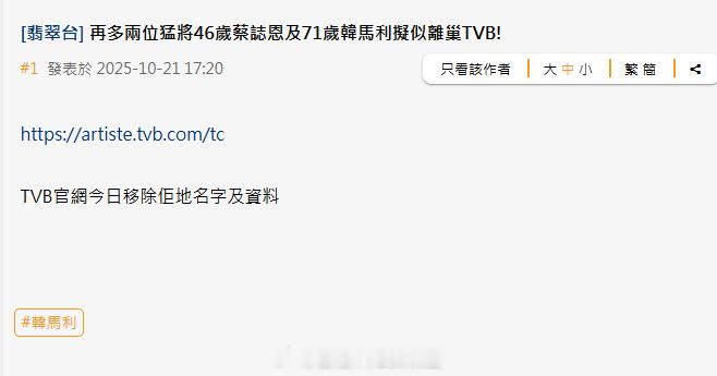 明报:71岁韩马利疑似离巢TVB 艺人资料遭TVB官网删除