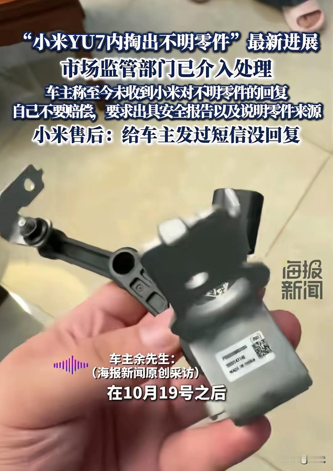 近日,“小米车内掏出不明零部件”事件持续引发关注,最新消息显示,市场监管部门已介入调查,而车主提出的两项诉求也成为焦点。 车主在整理车辆时,于座椅下方发现一个不明金属部件,该部件与车辆原有零件明显不符。车主联系小米汽车客服,但对方仅表示“可能为生产过程中遗留的边角料”,未给出具体解决方案。车主将视频发布至社交媒体后,事件迅速发酵。 事件发酵后,当地市场监管部门高度重视,已成立专项调查组介入调查。调查组将重点核查该零部件的来源、生产流程是否合规,以及车辆是否存在安全隐患,并要求小米汽车提供相关生产记录和质检报告。 面对事件,车主明确表示“不要任何赔偿”,但提出了两项具体诉求:一是要求小米出具车辆无安全隐患的说明,希望小米汽车能提供权威机构出具的检测报告,证明该零部件未影响车辆安全性能;二是要求小米出具零部件来源的说明,希望小米能明确该零部件的来源,包括生产批次、安装流程等,以消除公众疑虑。车主强调:“我的诉求很简单,就是要一个明确的答案。” 小米汽车官方回应称,已成立专项小组配合市场监管部门调查,并承诺将第一时间公开调查结果。同时,小米汽车表示,已对同批次车辆进行排查,暂未发现类似问题,还将加强生产流程管理,避免类似事件再次发生。 此次事件仍在调查中,车主的诉求和市场监管部门的介入,体现了公众对车辆安全的高度重视。我们期待调查结果早日公布,也希望小米汽车能通过此次事件,进一步提升产品品质。