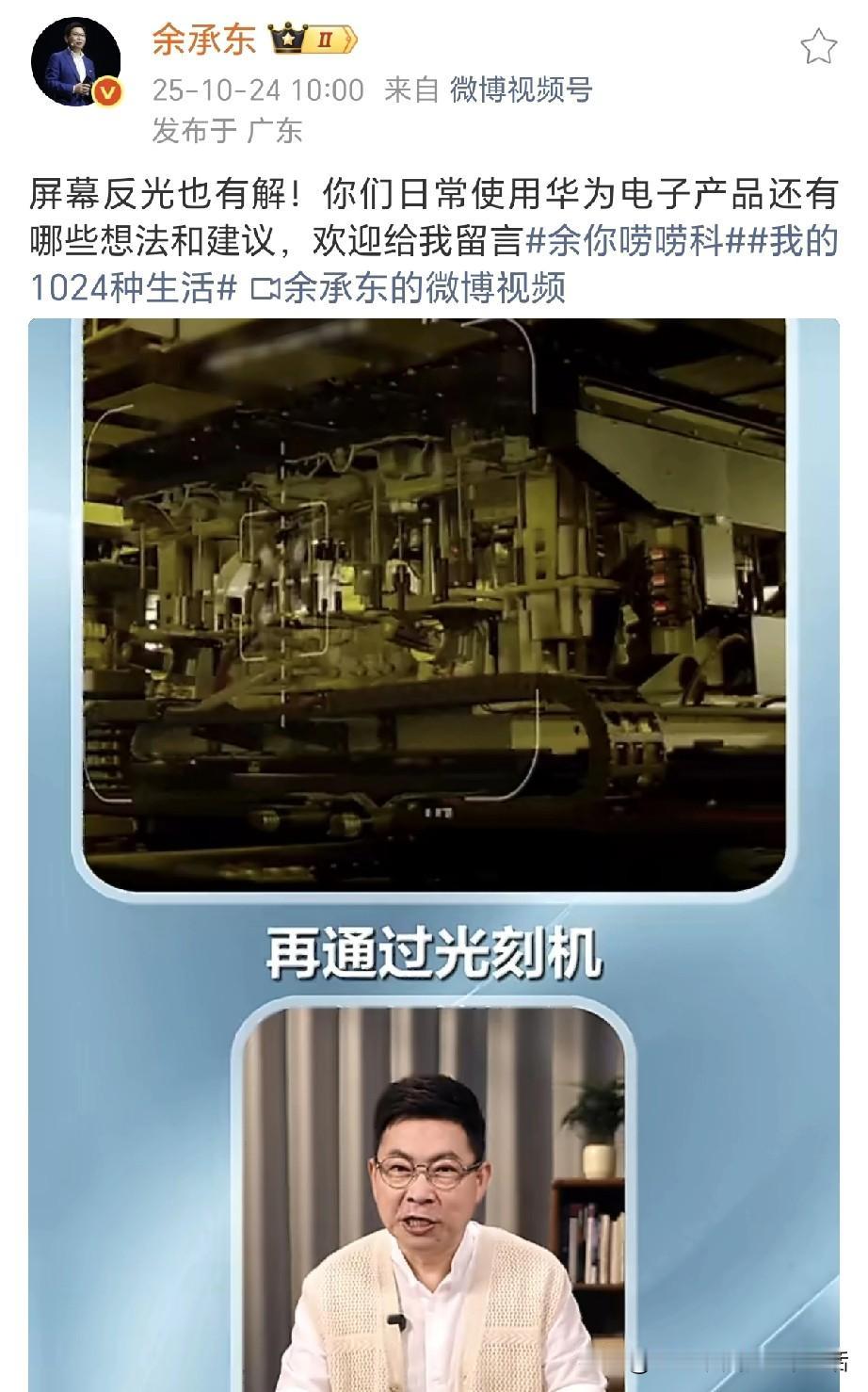 余承东突然发文透露重要信息! 余总在社交媒体上发视频说,华为第一代的柔光屏,华为在屏幕上运用了芯片领域常用的光刻技术,先在屏幕表面涂敷光刻胶。 网友们绷不住了!大家都听到了余总提到了光刻技术和光刻机! 万万没想到,光刻机就这么说出来了! 值得一提的是,余总的这条视频结尾不是“强得飞起!”,变成了“和我一起升级 鸿蒙操作系统6”。 余总为啥要换掉“强得飞起!”,我觉得“强得飞起!”很符合余总的气质!蛮好的,希望余总能换回来! 你们觉得呢?