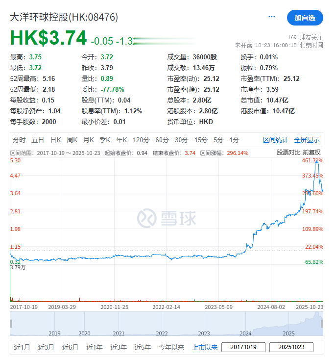 大洋环球控股(08476.HK),于2017年10月19日在港交所挂牌上市,目前市值约10.47亿港元。其市值在GEM板上市公司中排在第九位。