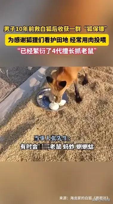 【太暖了!东北男子救白狐10年,竟收获一群“狐保镖”】 10年前,黑龙江五常市农民张先生上山救下两只受伤白狐,每日投喂照料。没想到,这份善举开启了一段跨越十年的奇妙缘分!白狐伤愈后未离去,反而在田边安家,繁衍四代,如今家族壮大至20多只。它们白天潜伏,夜里巡逻,专抓啃食稻谷的田鼠,化身“生物控鼠天团”,为张先生守护300亩良田。为表感谢,张先生每周投喂鸡架、螃蟹等“豪华餐”。人与狐默契十足,他一到田头,狐群便轻咬裤脚引路。网友感动:这才是现实版“狐仙报恩”!黑龙江