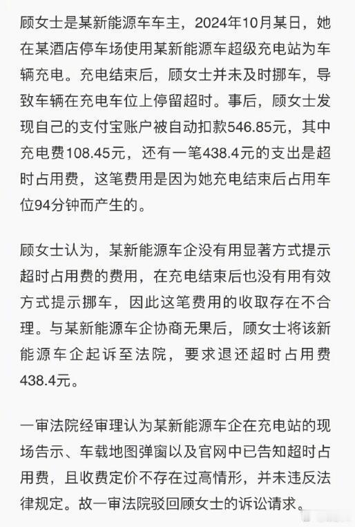 新能源车占位充电94分钟被收438元法院称超时占充电桩损害他人权益