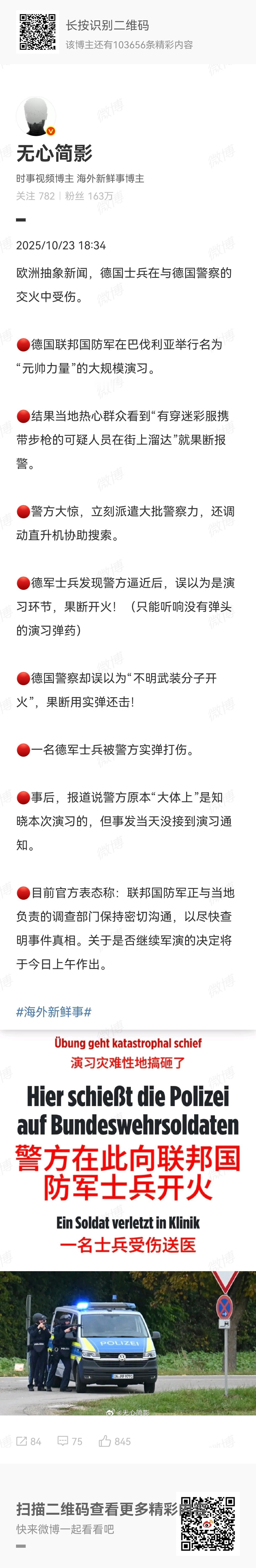 转载一则搞笑的新闻,关于德国人的,就是那个到处宣扬自己很严谨的德国人。 1.当地时间10月22日,德国联邦国防军正在进行代号为“北方风暴2024”的大规模演习。 2.因演习区域紧邻居民区,部分市民看到“蒙面武装人员”误以为社区遭遇恐怖袭击,便 立即拨打了紧急电话报警。 3.接到报警电话的当地警方,神速到达演习现场,看到现场确实有很多“蒙面武装人员”,马上严阵以待,准备开始“反恐行动”。 4.参加演习的军人看到严阵以待的警察,以为是演习的一部分,向警车发射训练弹(只有声音的那种)以示“配合”。 5.警方以为自己恐怖分子的还击,用实弹还击,导致一名德军士兵腿部中弹受伤。 6.双方看到有人受伤,双方叫停了对峙行动,复盘了一下,发现是个大乌龙。幸好士兵无生命危险。 德国人果然很严谨~~~