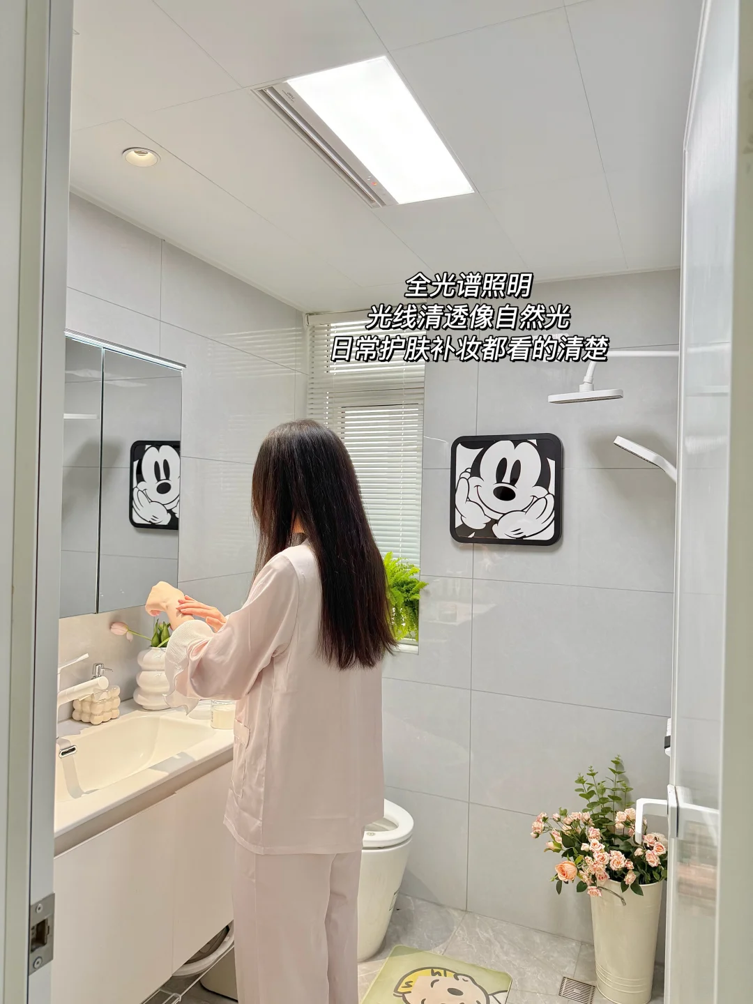 它的全光谱照明💡也很值得一说,无框设计的大照明把浴室照得亮堂堂,光线像清透的自然光,平时护肤补妆都能看得清清楚楚,灯光不仅明亮还护眼。半夜起夜也方便,提前设置好晚上11点后自动开启夜灯,人走进浴室就自动打开了,再也不用摸黑磕磕碰碰。