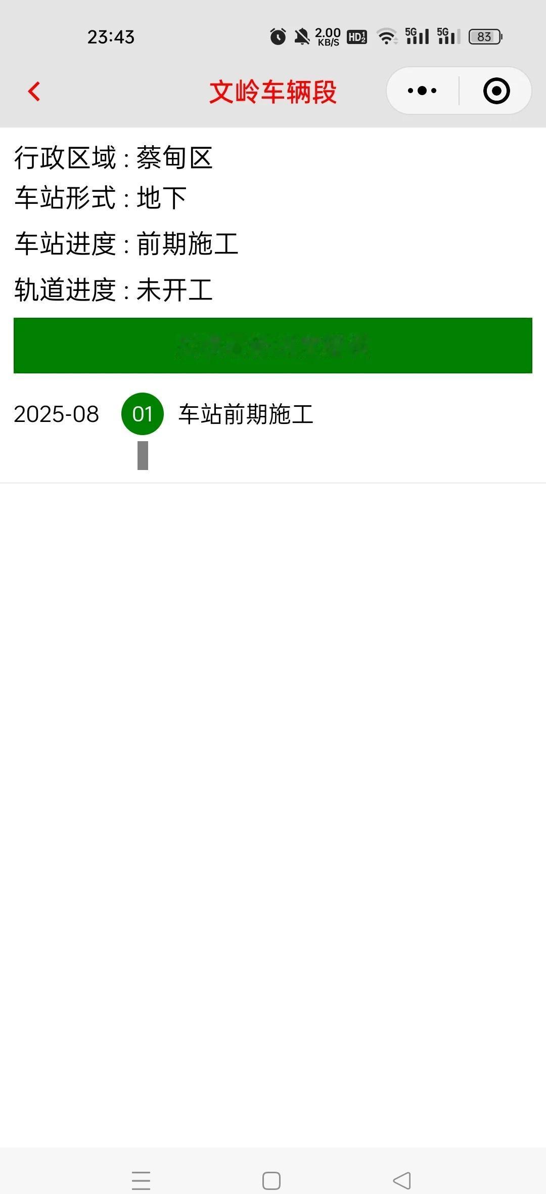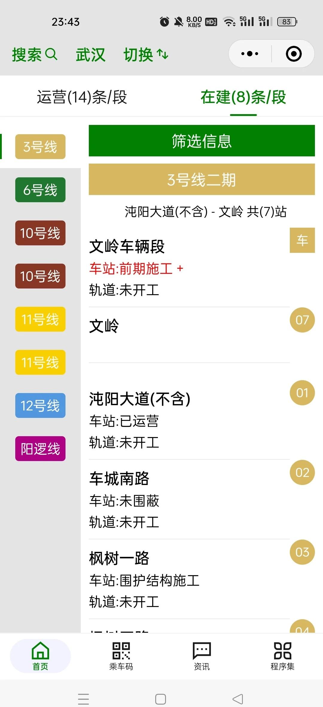 武汉地铁3号线二期进度跟踪(2025-10) 慧信息每天搜集和整理全国地铁运营资讯与在建进度信息。 3号线二期(沌阳大道-文岭),计划开通时间:待定。7座地下车站中,1座已开通,5座土建施工,其中4座围护结构施工,1座主体施工,1座前期准备,其中1座未围蔽;14个轨行区间中,14个前期准备。文岭车辆段前期施工。 本月新增进度:无