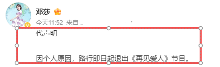 10月24日,就在《再见爱人5》开播前一个小时,邓莎发文宣布:因个人原因,路行即日起退出《再见爱人》节目。
