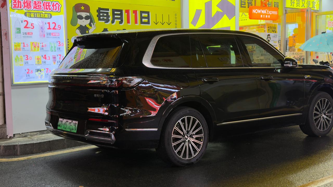 前两天看到一台黑色的吉利银河M9,晚上+黑色车身不太看得出线条感,但整体车身挺大,远看就挺有质感。 吉利银河M9车长5.2m,轴距超3m,三排座椅均支持电动调节+加热;1.5T+三电机配置,综合续航里程超1000公里;搭载千里浩瀚H5架构,支持高速/城区NOA领航、自动避障等功能,18.38万元-24.88万元的价格是真的很香。