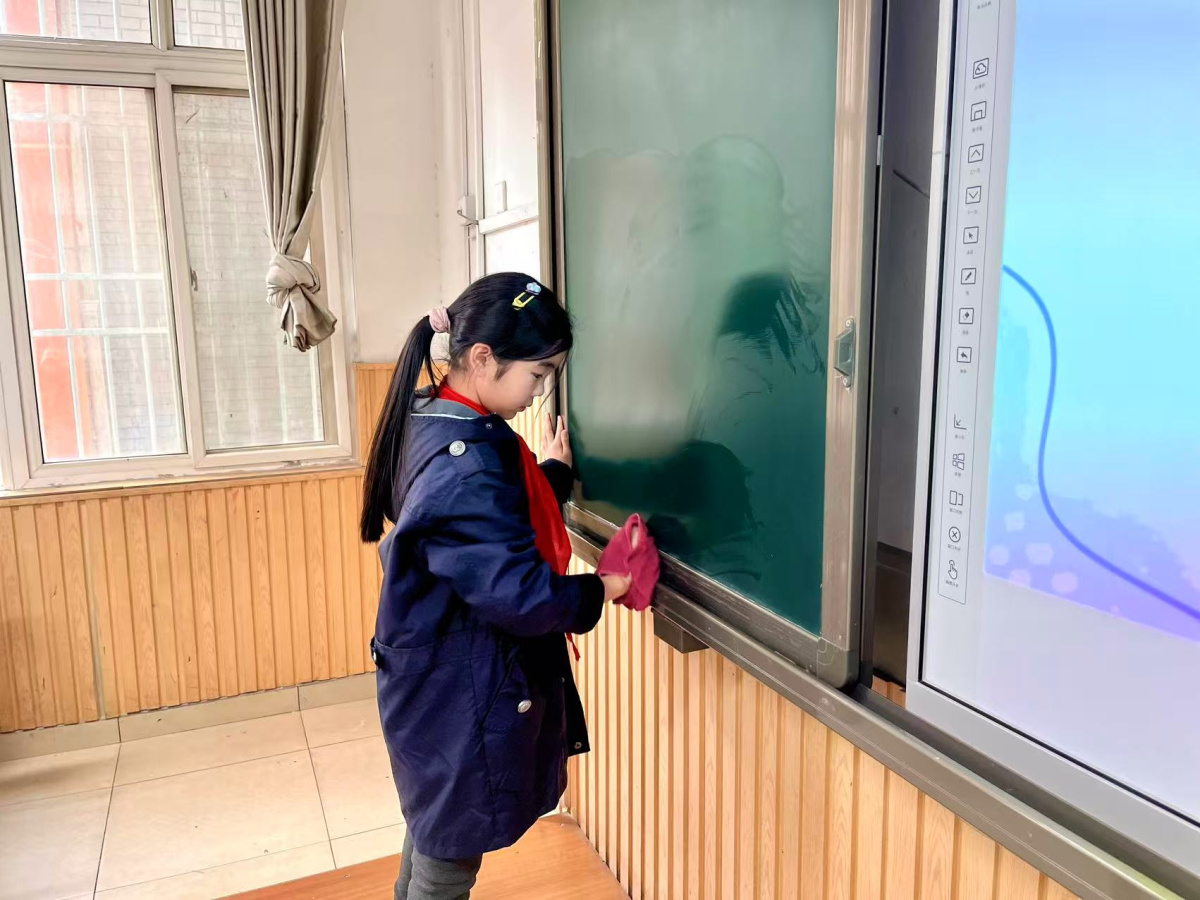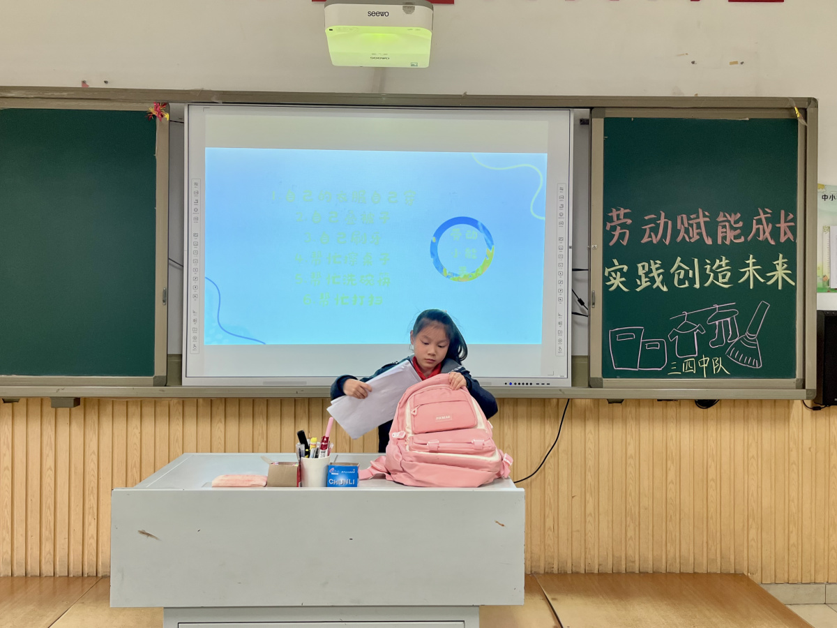 为让劳动教育从“理论”走向“实践”,此次队会特别设置了“劳动技能小比拼”环节。同学们分组参与了整理书包、系鞋带、擦黑板等实践任务,在紧张有趣的比拼中,既锻炼了生活技能,也增强了团队协作意识。此外,各中队还发起了“劳动实践打卡”倡议,鼓励大家在课后主动承担家务劳动、参与社区志愿服务,将劳动精神融入日常生活,用实际行动践行“实践出真知”的道理。