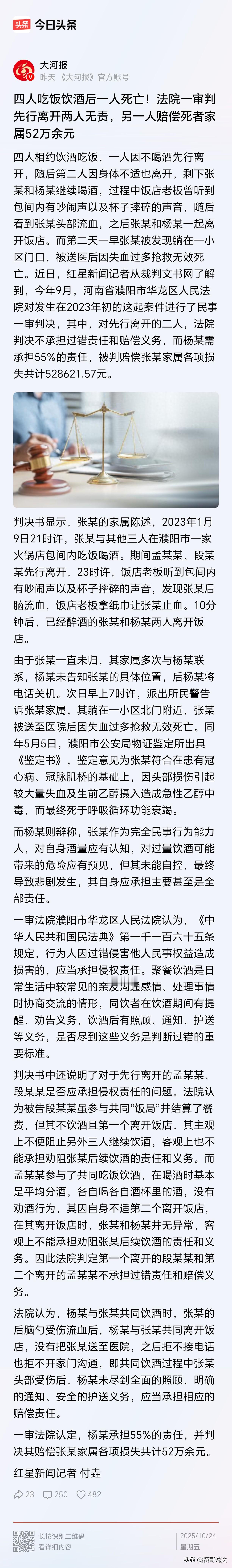 “喝酒又惹上事了!”河南濮阳,一男子与三位朋友到饭店聚餐喝酒。期间,两位朋友提前离开。男子便和剩下的一位朋友继续喝,在此过程中,男子头部摔伤流血,不料第二天却被发现死在了某小区门前。男子家属随后将当晚一同饮酒的三名朋友告上法院,索赔94万余元,法院判了。 俗话说,酒逢知己千杯少。闲暇时,三五好友聚餐饮酒、谈天说地,实乃人生一大乐事。 然而,有时人们因尽情畅饮而忘了自己的酒量,导致醉酒,往往会酿成悲剧。 河南濮阳的张先生就是个典型例子。 据大河报10月23日报道,2023年1月的一天,张先生和孟某、段某、杨某三人到当地一家餐馆喝酒聚餐。 聚餐时,段某未饮酒,其他人推杯换盏、把酒言欢,十分畅快。 几杯酒下肚,段某和孟某先后因有事离开了餐馆。 张先生和杨某则继续留下喝酒。 大约晚上11时,张先生可能因醉酒摔倒,头部流血。 餐馆老板听到动静,拿纸巾为张先生止血。 大概过了10分钟,张先生和杨某离开餐馆。 张先生迟迟未回家,其家属便给杨某打电话询问行踪,杨某不仅未告知张先生具体位置,还关了机。 直到第二天清晨,警方接到报警,才发现张先生倒在一小区门口附近,已没了生命迹象。 经鉴定,张先生死因是在患有冠心病等基础疾病的前提下,头部受伤失血过多及急性酒精中毒,引发呼吸衰竭身亡。 事后,张先生家属将当晚一同聚餐的孟某、段某、杨某三人告上法院索要赔偿。 对此,三人都提出了反驳意见。 段某称,当天他没喝酒,还是第一个付了餐费离开的,对后面的事一无所知,不应担责。 孟某认为,他们只是朋友间的正常聚餐,当天大家各喝各的酒,不存在劝酒行为。 后来他因身体不适离开,当时张先生状态正常,他无法预知后续的事。 杨某表示,他和张先生一起喝酒没错。 但张先生是成年人,能控制自己能否饮酒及饮多少,也能预知过量饮酒的危害。 发生这样的事,张先生应自己负责。 法院会怎么判呢? 首先要明确,根据《民法典》第1165条规定,行为人因过错侵害他人民事权益造成损害的,应承担侵权责任。 正常人之间适量饮酒属情谊行为,本身不产生法律义务,法律不应干涉。 但同饮者有提醒、劝阻、注意的义务,该义务源于先行行为导致的可预见危险状态。 简单说,判断孟某、段某、杨某三人是否担责,主要看他们在张先生饮酒及醉酒后是否尽到相应义务。 1、段某当天没喝酒且提前离开,客观上无法知晓后续情况并采取预防措施。 段某对张先生的死亡结果无需担责。 2、孟某当天虽喝了酒,但无劝酒等行为,也提前离开了餐馆。离开时张先生状态正常,不能要求孟某提前预知张先生会出事。 孟某也无需担责。 3、至于杨某,从聚餐开始到结束,他一直陪张先生喝酒。 张先生醉酒和受伤的情况,杨某都清楚,但他既没送张先生就医,也没联系家属,而是放任不管。 张先生家属询问情况时,杨某不配合,还关了机。 杨某没对张先生尽到注意和帮助义务,最终酿成悲剧,他难辞其咎。 4、张先生是成年人,明知自己有疾病,却不克制,过量饮酒致醉,将自己置于危险境地。 张先生对自己的死亡结果也负有不可推卸的责任。 法院最终判决,孟某、段某对张先生的死亡结果无过错,不承担责任。 杨某则需承担55%的责任,即向张先生家属赔偿52万余元。 总体而言,这样的悲剧谁都不愿看到。 同时,这也提醒我们,饮酒要有品更要有度,要量力而行,不可肆意妄为。 当然,共饮人看到身边人醉酒后,一定要伸出援手,因为不经意的举动,可能改变一个人的命运。 对此,你怎么看?欢迎在评论区留言。