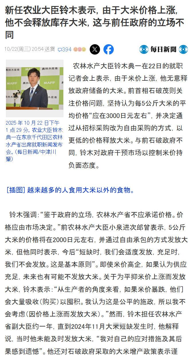 而日本的新任农业大臣铃木表示,虽然日本大米价格上涨,但是他不会释放库存大米,这与石破茂时期的立场不同。