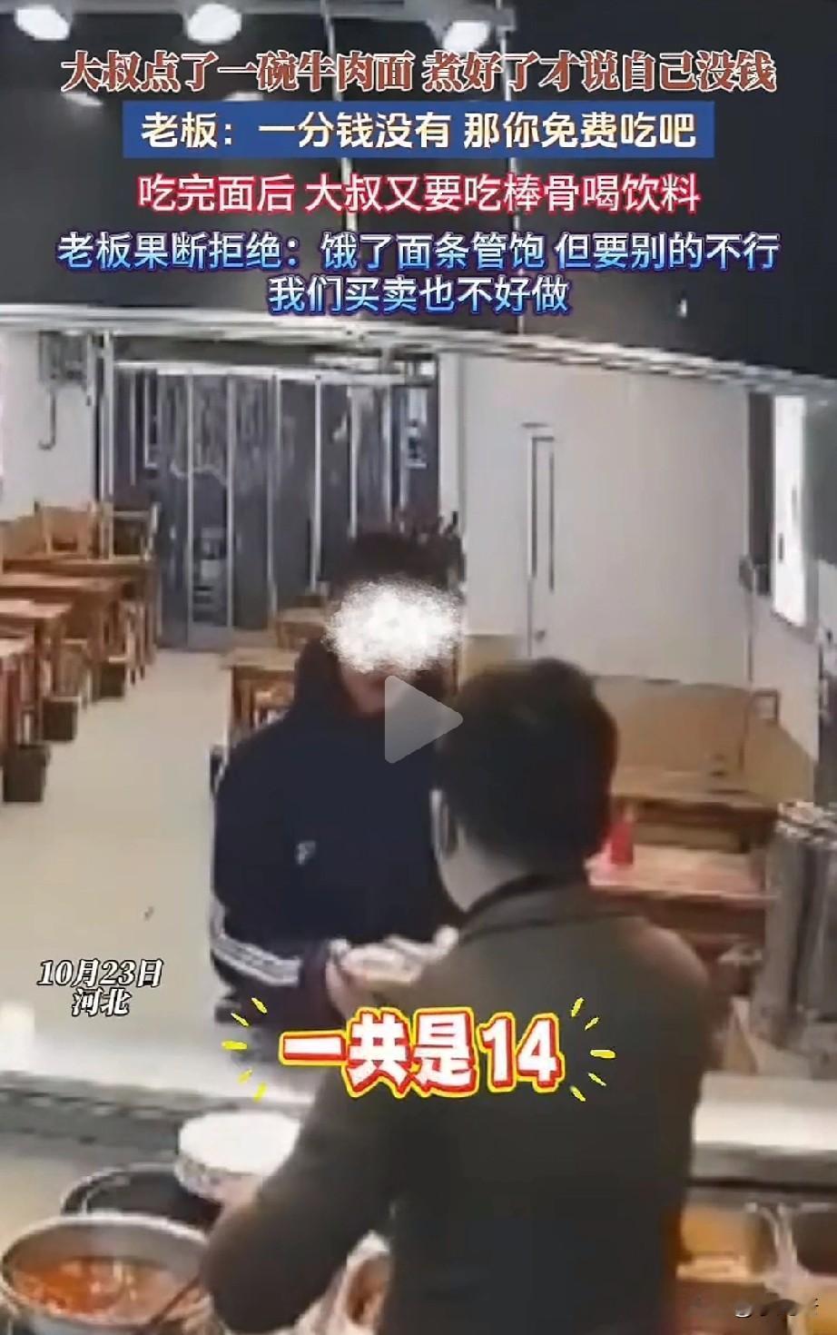 河北一店主发视频,一位大叔点了一份板面,总共14元,点之前大叔没说没钱,等面好了