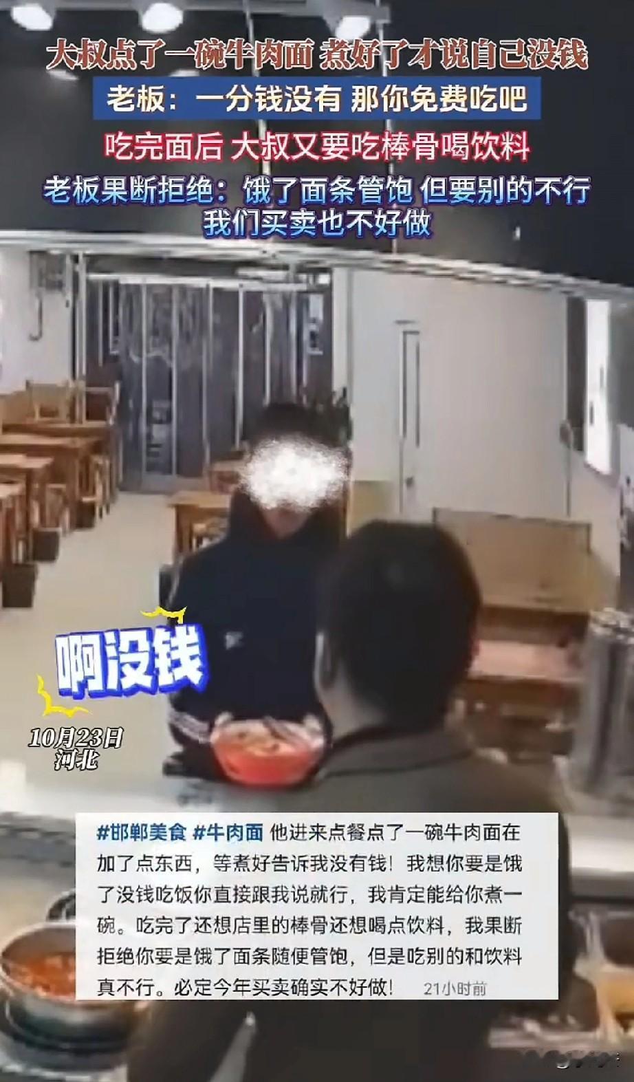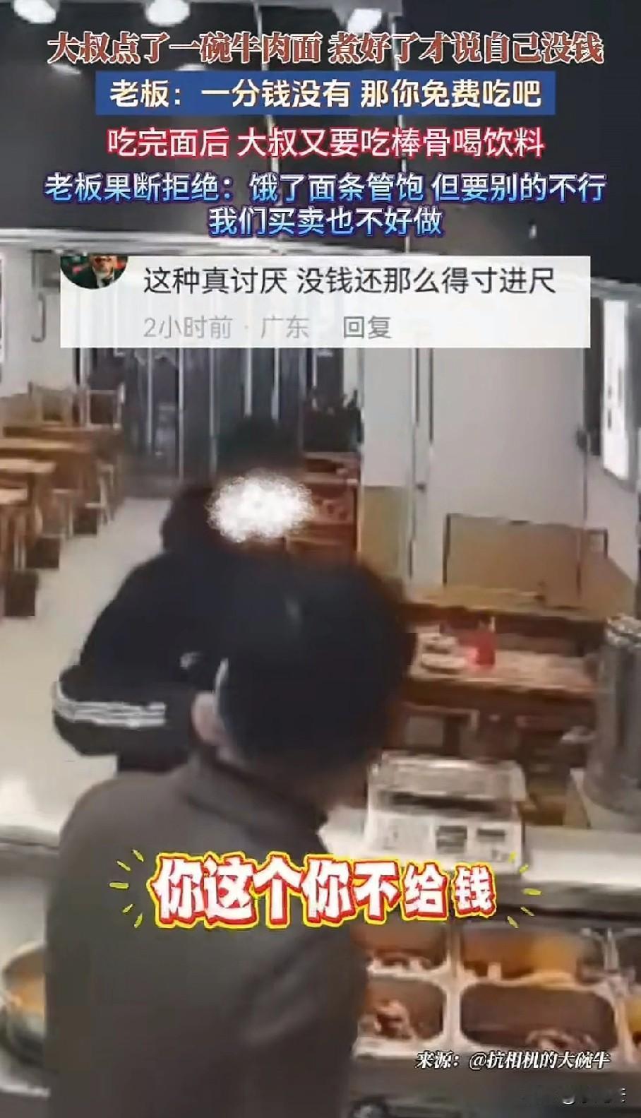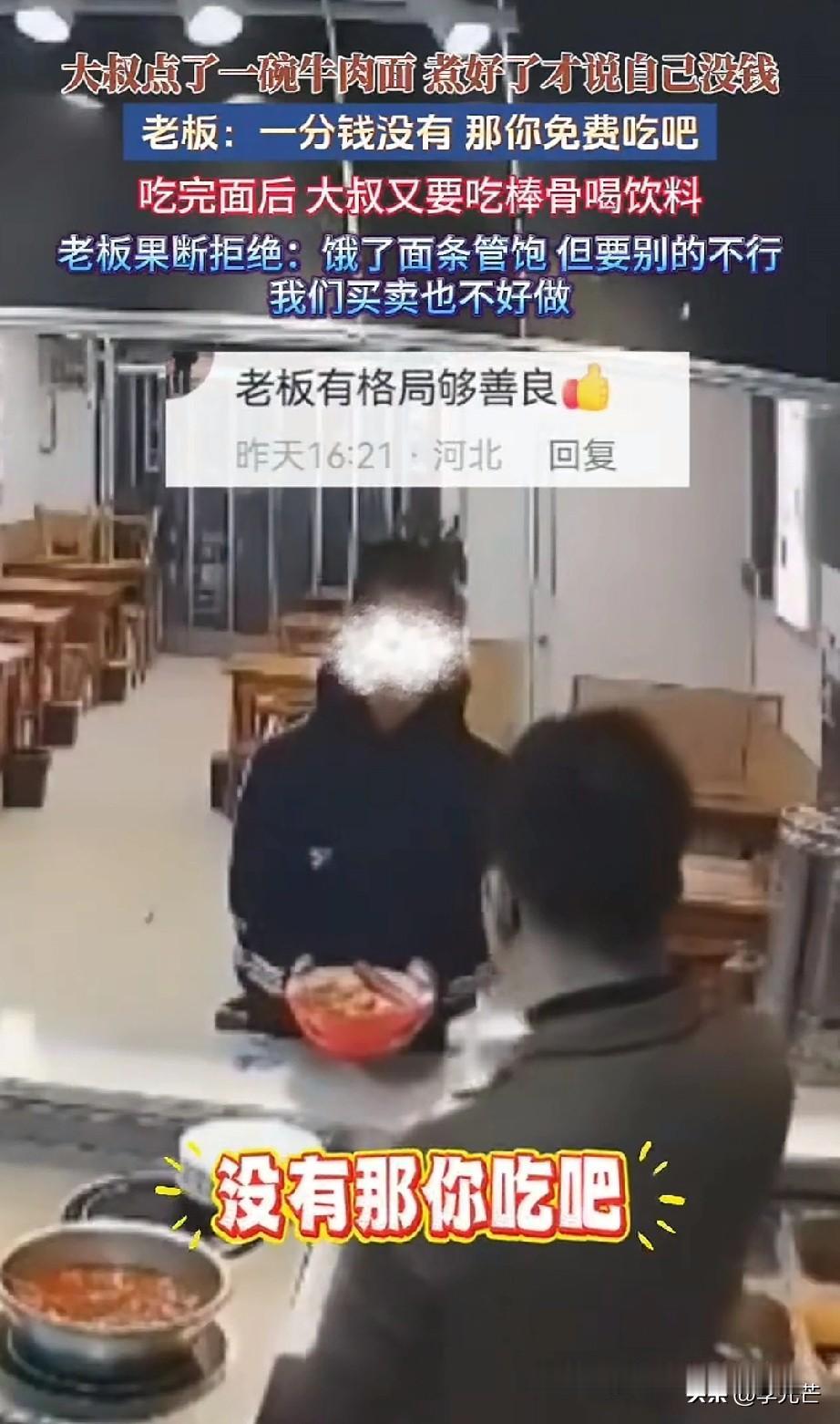 河北一店主发视频,一位大叔点了一份板面,总共14元,点之前大叔没说没钱,等面好了端给他要付钱时,他说一分没有。老板想,没有就没有吧,就当做好事,给他吃碗面。不料大叔还觉得面太素了,想加棒骨还想喝饮料,店主一摆手拒绝,面可以免费吃,棒骨和饮料不能再免费,谁也供不起! 店老板表示,如果大叔一开始就说,自己困难没钱吃饭,提前给他说的话,他会很热心的给做。当时进来点面的时候,啥也没说,等到面都做好了,才说自己没钱,感觉一点都不真诚。 大叔吃完一碗面,又觉得不够,还指着桌子上的大棒骨,想要吃个大骨头,老板说不给钱的话,只能给吃面,不能再吃肉。 后来又说想喝白开水,店主也表示喝水可以,想喝多少都可以。但是大叔又直接朝饮料柜走去,打开门就想拿饮料。 店主很无奈的说,有钱什么都能喝,没钱的话只能喝白水。 很多人赞同老板做法,没有钱去吃饭,也没提前说,就很强迫,店主格局够大,最起码还给了一碗面,就不应该得寸进尺。 换句话说,免费吃了面,却还想吃大骨头、喝饮料,这样的人也不是真窘迫,真正穷的人,那碗面都会觉得太奢侈!