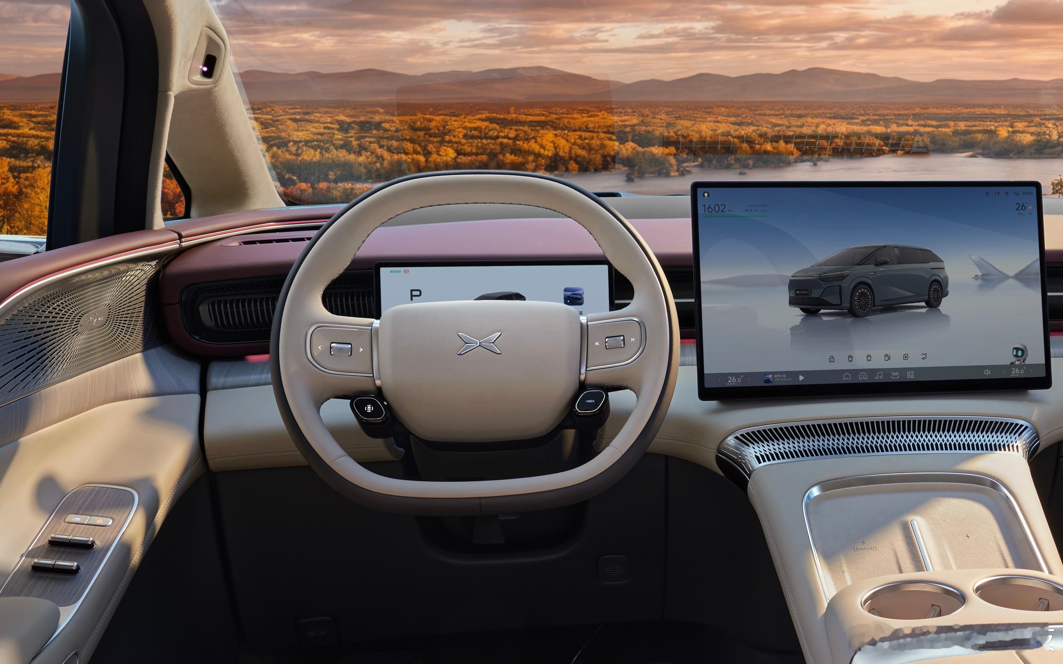 【小鹏X9增程版内饰官图公布】小鹏汽车今日发布X9增程版内饰官图,主打“星舰头等舱”设计理念。新车新增“云间玫棕”配色,采用软包与真木材质,配备穹顶星轨氛围灯、AI航空阅读灯及“水滴涟漪”扬声器。二排独立座椅支持零重力模式,并有望搭载车载冷暖箱,方向盘则命名为“星舰领航”。
