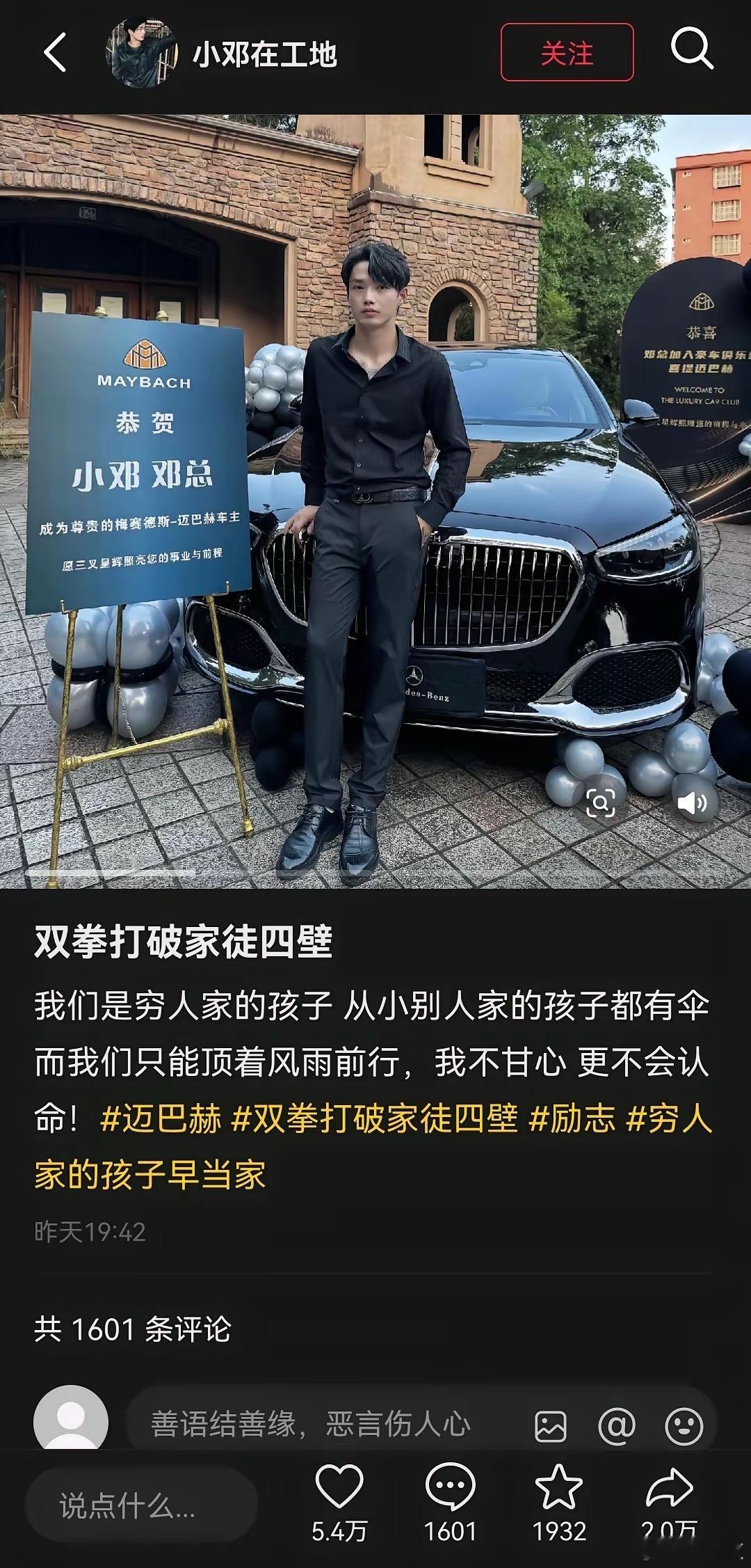 刚看到一个一个小伙子27岁靠自己买了奔驰迈巴赫,双手打破家徒四壁,干工地加做自媒