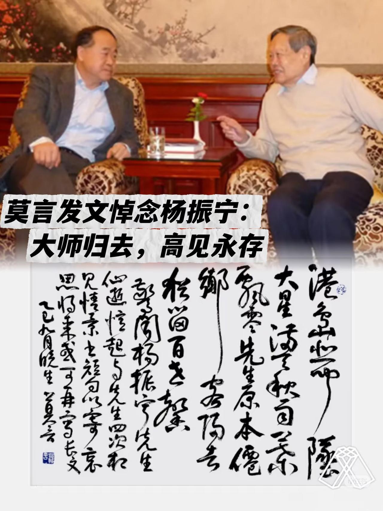 杨振宁和莫言, 我不羡慕杨振宁的诺奖光环, 也不羡慕莫言的文学成就,但是看到他们的友谊,说实话我是真的羡慕了。 他们一起在《开讲啦》聊科学和文学,杨振宁说走了不同的路却都到了诺奖台,莫言说文学家看情感科学家看物质,聊得特别实在。 后来莫言被评传播中华文化年度人物,杨振宁亲自上场推介,莫言写联“仰观宇宙之大 俯察粒子之微”感谢,没虚头巴脑的话,就像老朋友之间的默契。 两个不同领域的大拿,没端架子没说客套话,就这么真诚地互相欣赏,这样的友谊,谁能不羡慕呢?