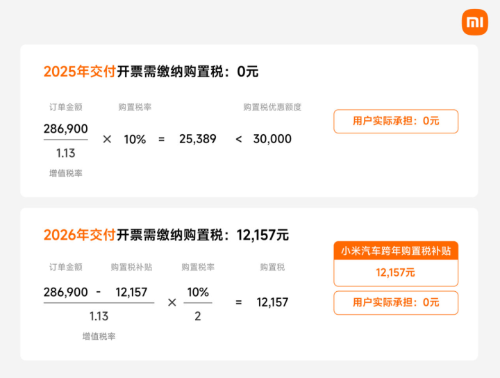 根据您实际购买价格产生的购置税,在2026年较2025年多出的差额,小米汽车将为您补贴差额,确保您“车价+购置税”的总成本不变。例如: