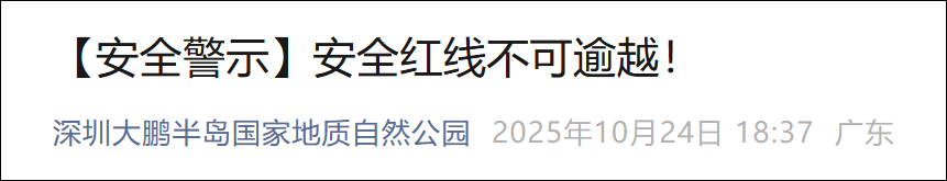 10月24日傍晚,深圳大鹏半岛国家地质自然公园微信公众号发布《[安全警示]安全红线不可逾越!》一文并呼吁: