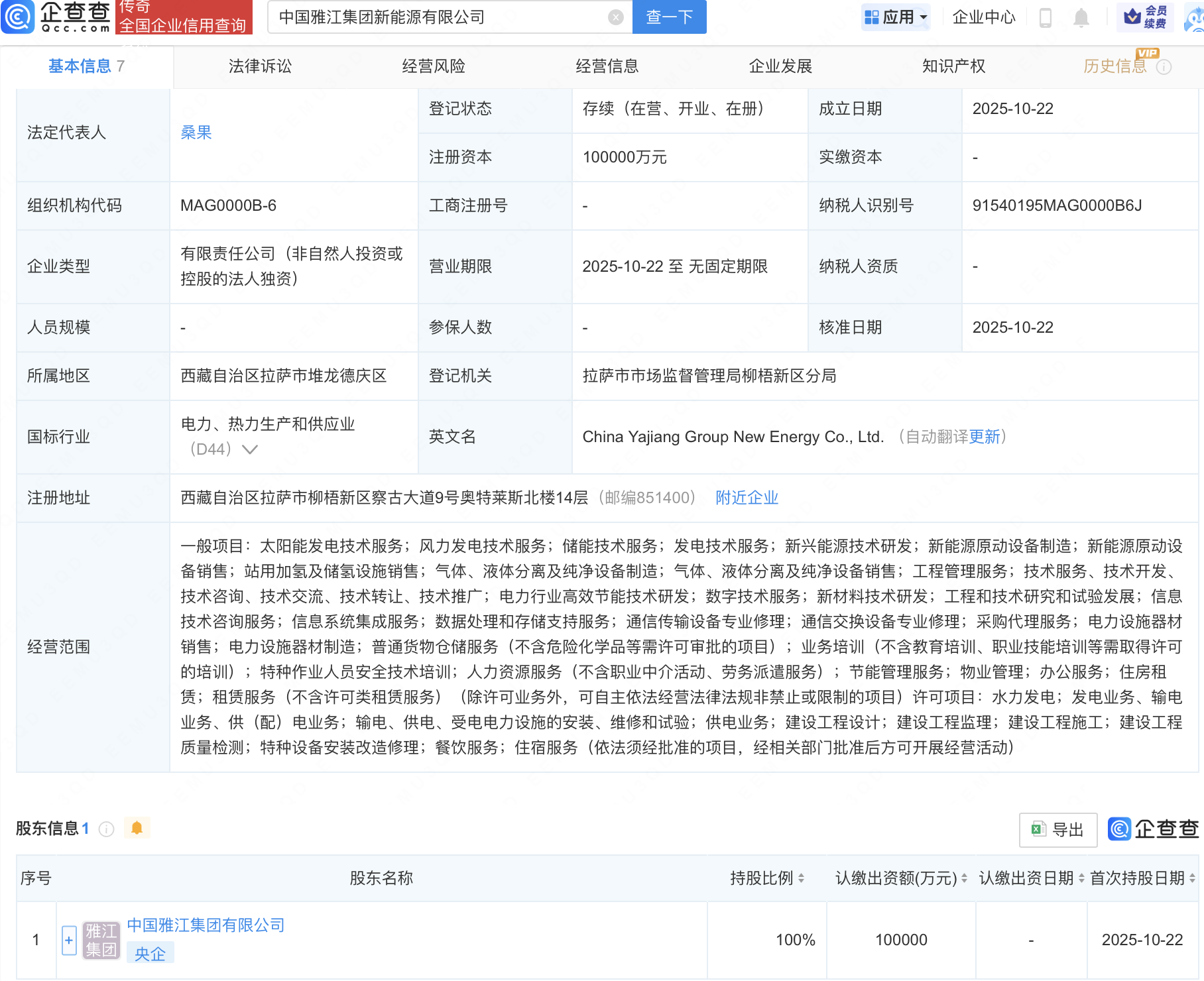企查查APP显示,近日,中国雅江集团新能源有限公司成立,注册资本10亿元,经营范围包含:太阳能发电技术服务;风力发电技术服务;储能技术服务;发电技术服务;新兴能源技术研发;新能源原动设备制造等。企查查股权穿透显示,该公司由中国雅江集团有限公司全资持股。