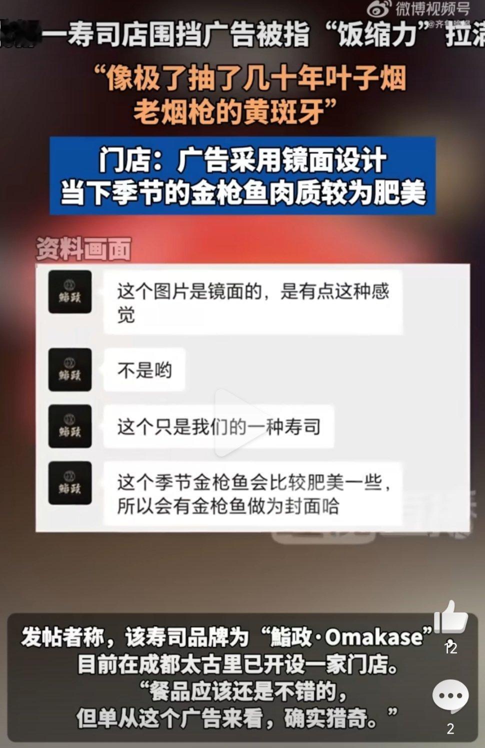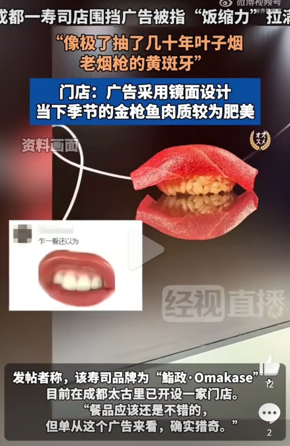 成都一寿司广告被吐槽饭缩力拉满“饭缩力”的吐槽,本质是广告设计与消费者期待的脱节。寿司本应传递新鲜精致感,但该广告的对称构图却意外引发“老烟枪黄牙”的联想 ,路过的食客直言“恶心”“食欲全无”。商家强调金枪鱼当季肥美,却用错误的视觉语言消解了卖点。餐饮宣传需精准匹配产品特质与大众审美,否则再用心的选材也会被糟糕的呈现毁掉。