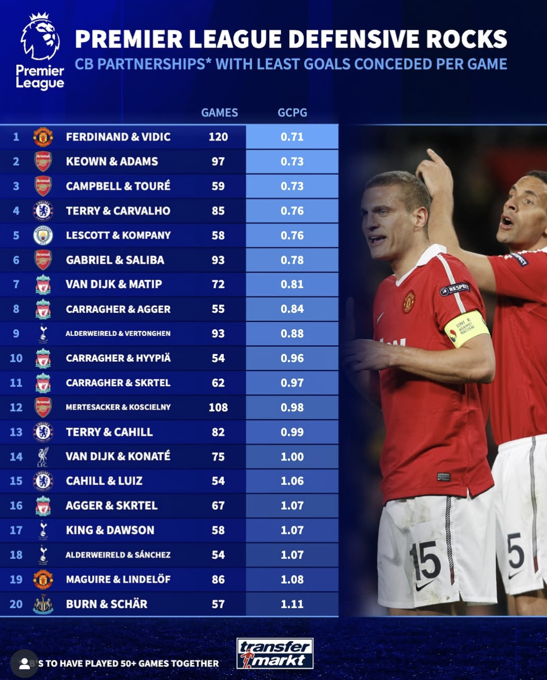 曼联的费迪南德&维迪奇组合在120场共同初赛比赛中场均丢0.71球居首,阿森纳的基翁&亚当斯组合以及坎贝尔&图雷组合以丢0.73球并列第二。