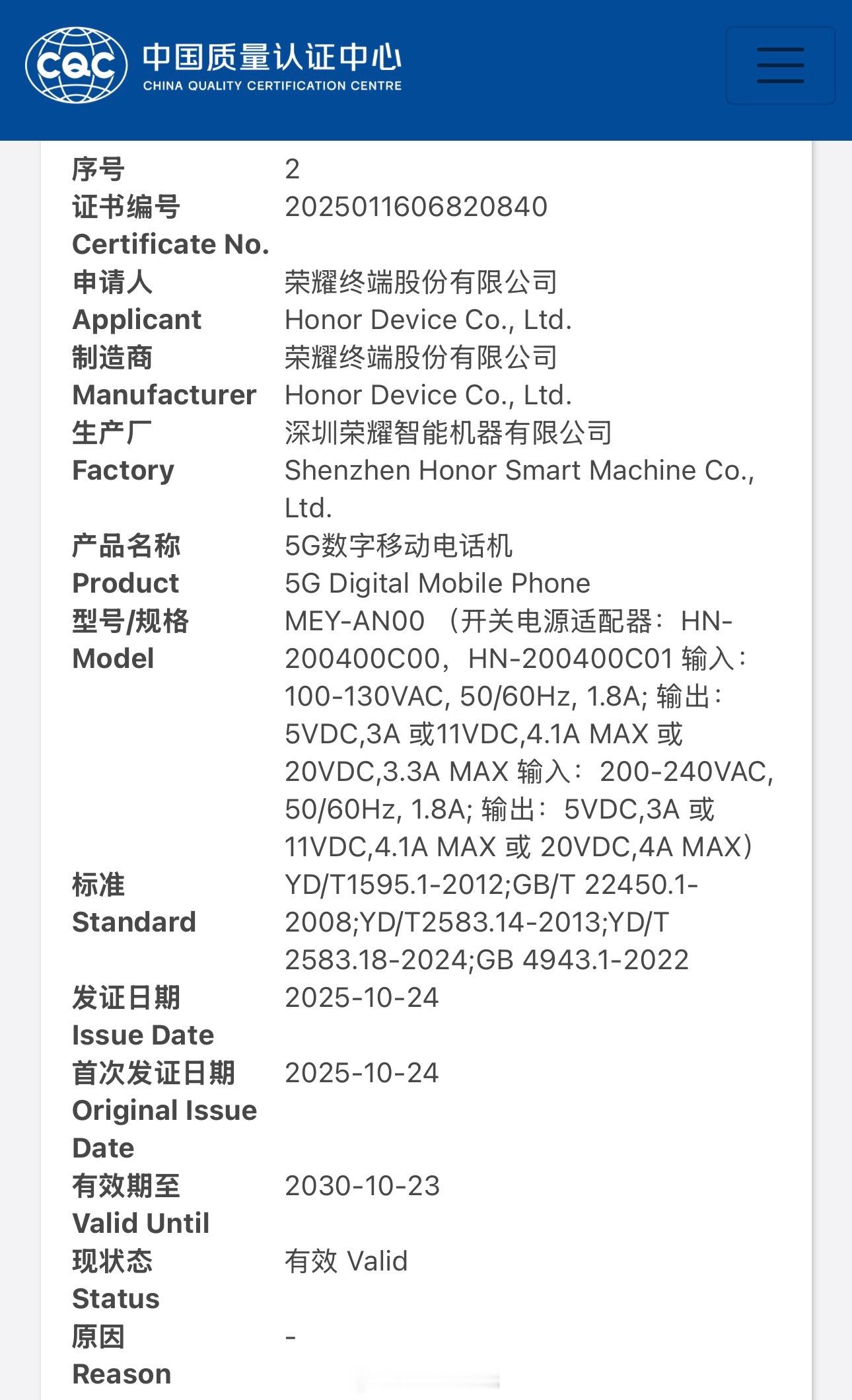 荣耀 500 及荣耀 500 Pro 通过国家质量认证,型号 MEP-AN00、MEY-AN00,支持 80W 快充,预计年底发布。[并不简单]
