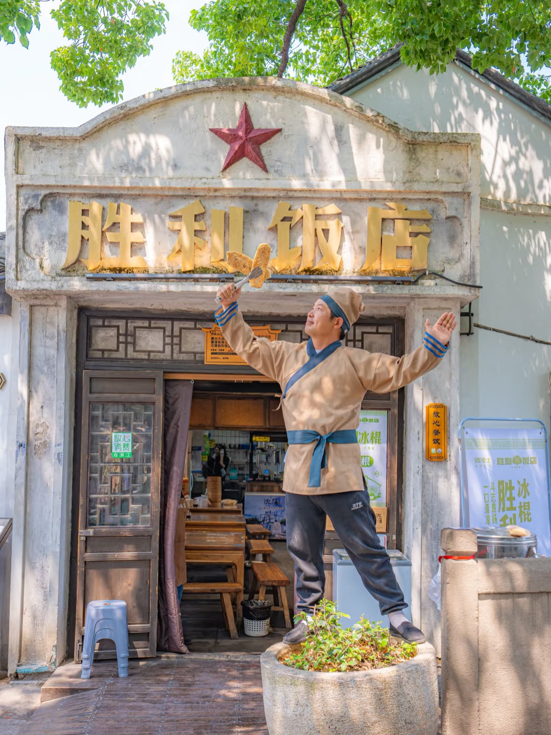 4️⃣沈荡: 古镇不大,两旁古建筑保留着浓厚的古风特色。“胜利饭店”必打卡!建议提前去,不然约不上位子~ 逛完古镇,别忘了去官酱园和谷仓,拍照也超有感觉!