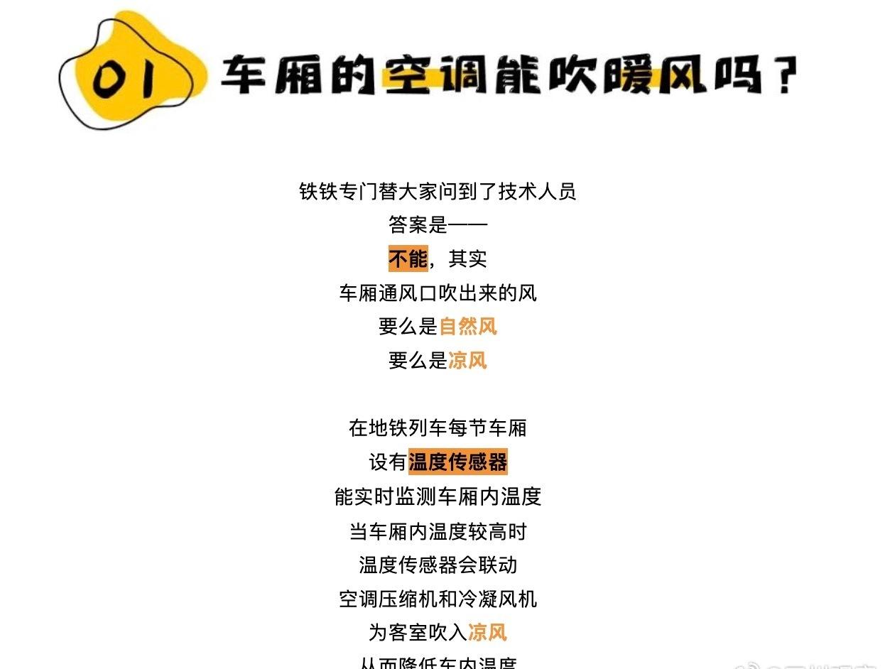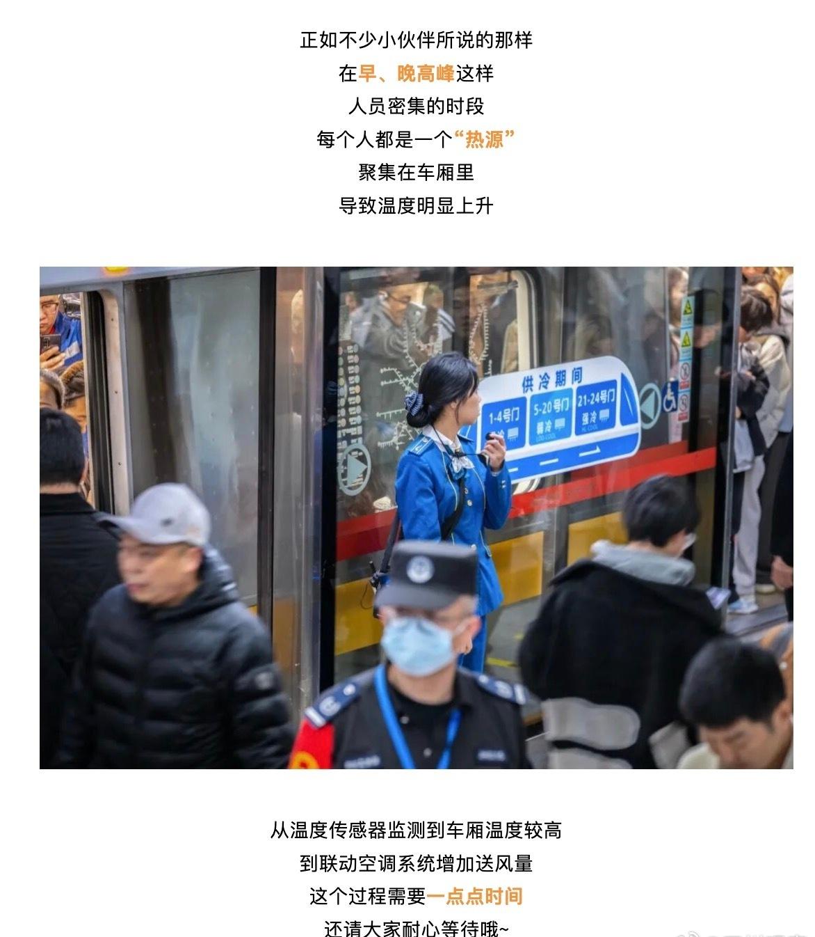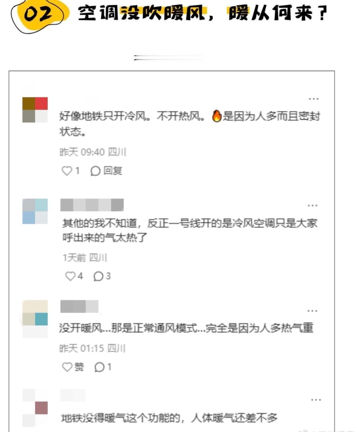 【成都地铁回应是不是开暖气了】近日,成都降温,没听错吧成都已经下雪了 有不少网友讨论“感觉成都地铁开暖气了”,对此,@成都地铁 发文回应:其实车厢通风口吹出来的风,要么是自然风,要么是凉风,不能吹暖风。当客室温度较低时,系统将停止制冷模式,改送自然风,保持车厢内的空气流通。感觉到地铁内较热,可能是因为在早、晚高峰这样人员密集的时段,每个人都是一个“热源”聚集在车厢里,导致温度明显上升。