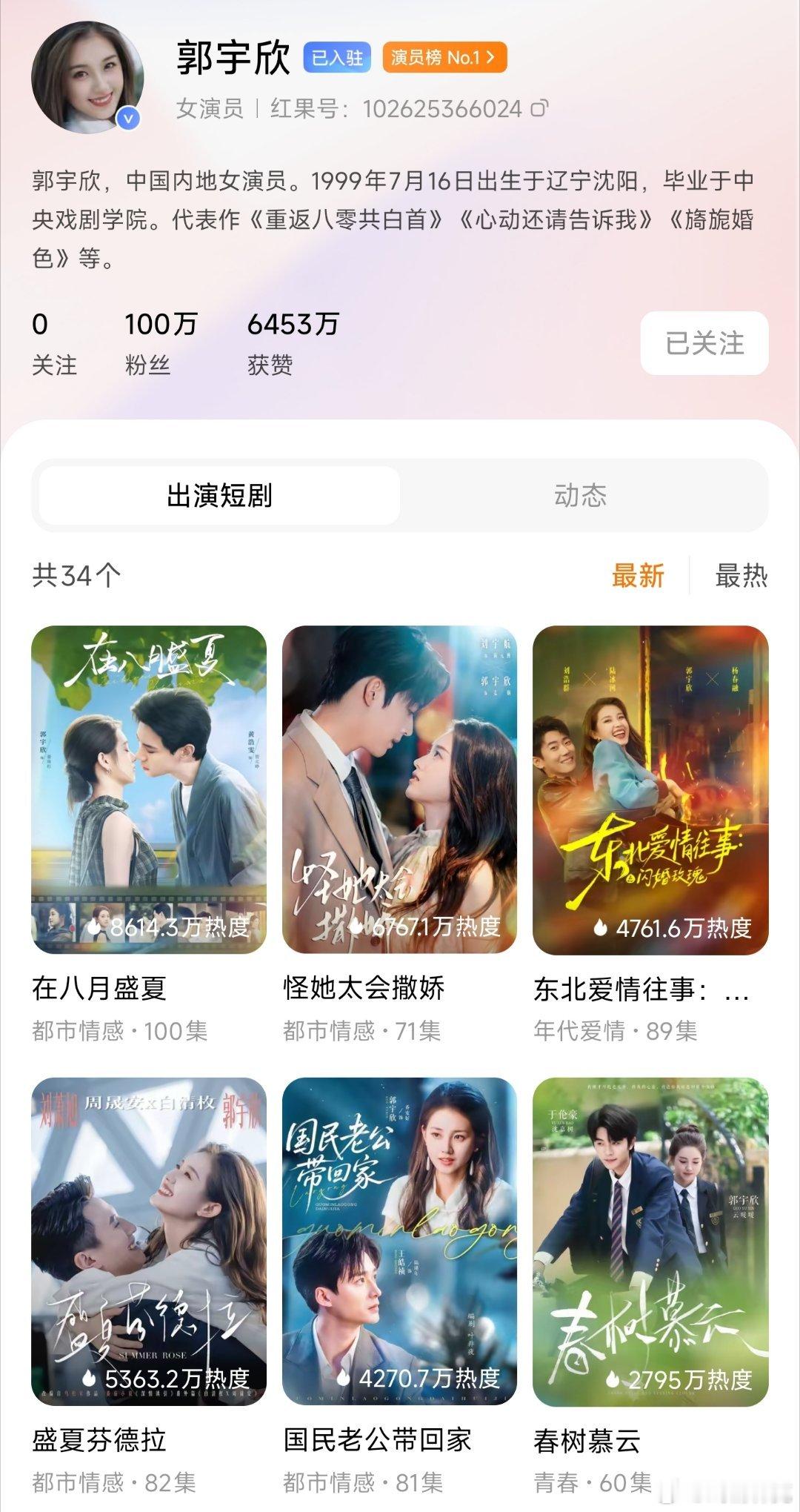 郭宇欣盛夏芬德拉之后上的三部剧拍得都不咋滴,但一人拖飞机成绩都还不错。我都刷到好几个博主说她是女短一了。