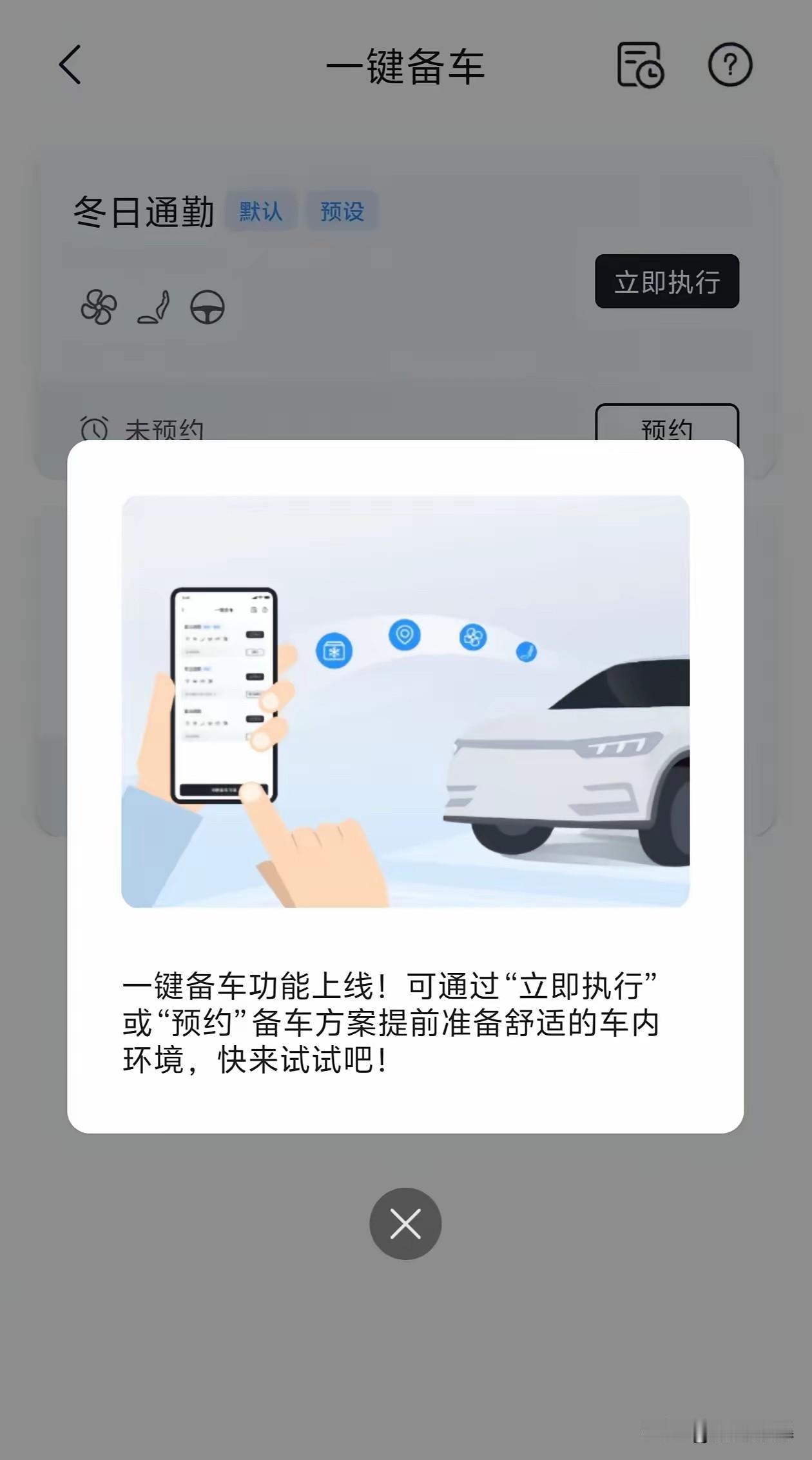 比亚迪频繁的OTA果然不白来! 千想万想,没想到比亚迪出来一个这样的功能,太实用了! 就是比亚迪的一键备车功能! 就是APP里面的一个按钮,可以直接打开多项功能,比如冷暖风、座椅通风、加热,方向盘加热等,还区分出来了冬日和夏日通勤,简直太实用了! 根本不用在打开引擎、调节温度一项项的操作了,太方便了! 大家的比亚迪车升级了吗?有没有这个功能?