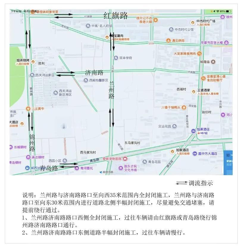 青岛平度市兰州路与青沙路交叉位置至胜利路南的高温水管道为双丰学府小区提供热源的高温水市政主管网工程项目,有关部门需对兰州路与济南路(兰州路西侧)路口进行道路封闭,封闭区域东西长35米,计划2025年10月29日—2025年12月12日对此段道路进行封闭及占道施工,实施交通调流;对兰州路与济南路(兰州路东侧)路口北侧进行半幅封闭,封闭区域东西长30米,计划2025年10月29日—2025年11月17日对此段道路进行路北侧半封闭及占道施工,实施交通调流。过往车辆和行人请注意交通标识、减速慢行或提前绕行。