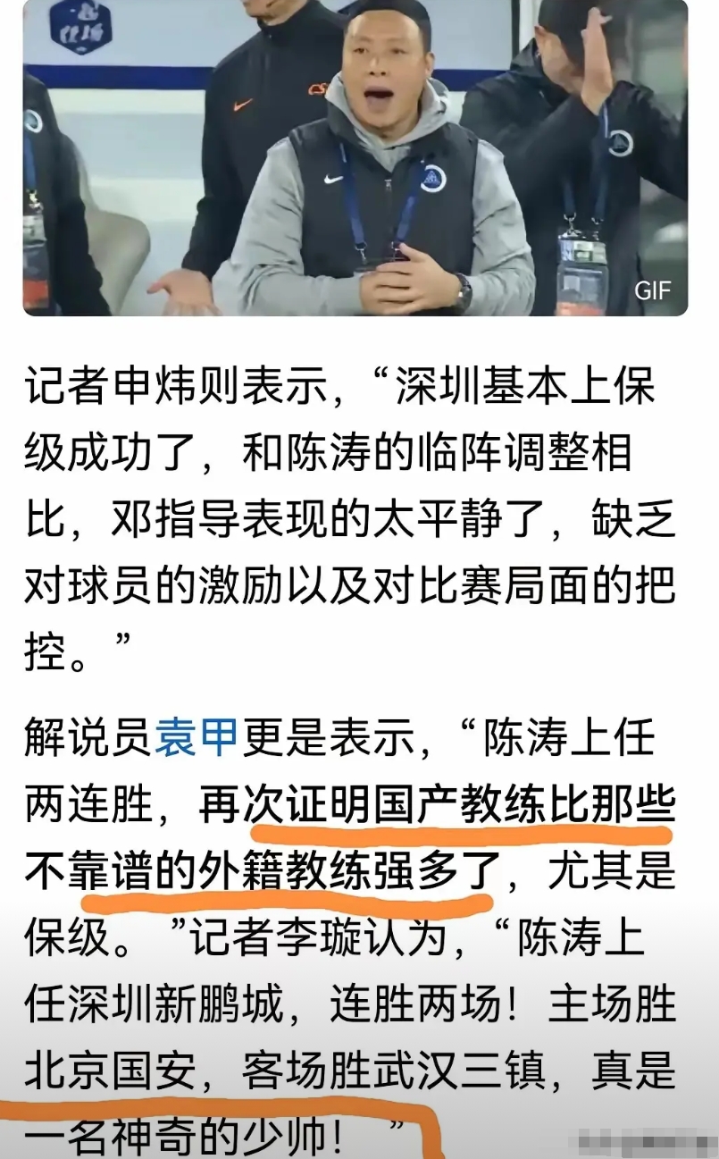 中国足球最大的“弊病”就是媒体,吹起来没边,踩起来也是毫无底线! 陈涛带领新鹏城取得“两连胜”完成保级大业的确可喜可贺,但是这些媒体人也太“势利眼”,就这样给吹上了,咱们截图为证,真到了有朝一日陈涛走入困局了,这些人如果开始落井下石,就把这个发出去,届时让他们自打自脸。 记得当初塞蒂恩被官宣国安主帅时,我们一些媒体就开始狂吹,什么本赛季中超最大牌主帅,他的传控足球会帮助国安实现腾飞,特别是拿到半程冠军,一些媒体人就开始说,国安是本赛季最有可能拿到联赛的冠军的球队,结果等到国安连续不胜,他们的口风就变了,什么难听的话都出来了。 如今陈涛带领新鹏城成功保级,这些媒体人就争相跳出来,溢美之词不绝于耳,如果下赛季陈涛扶正后如果带领球队出现困难,希望这些人不要忘了今天的话,别上去踩一脚就好!