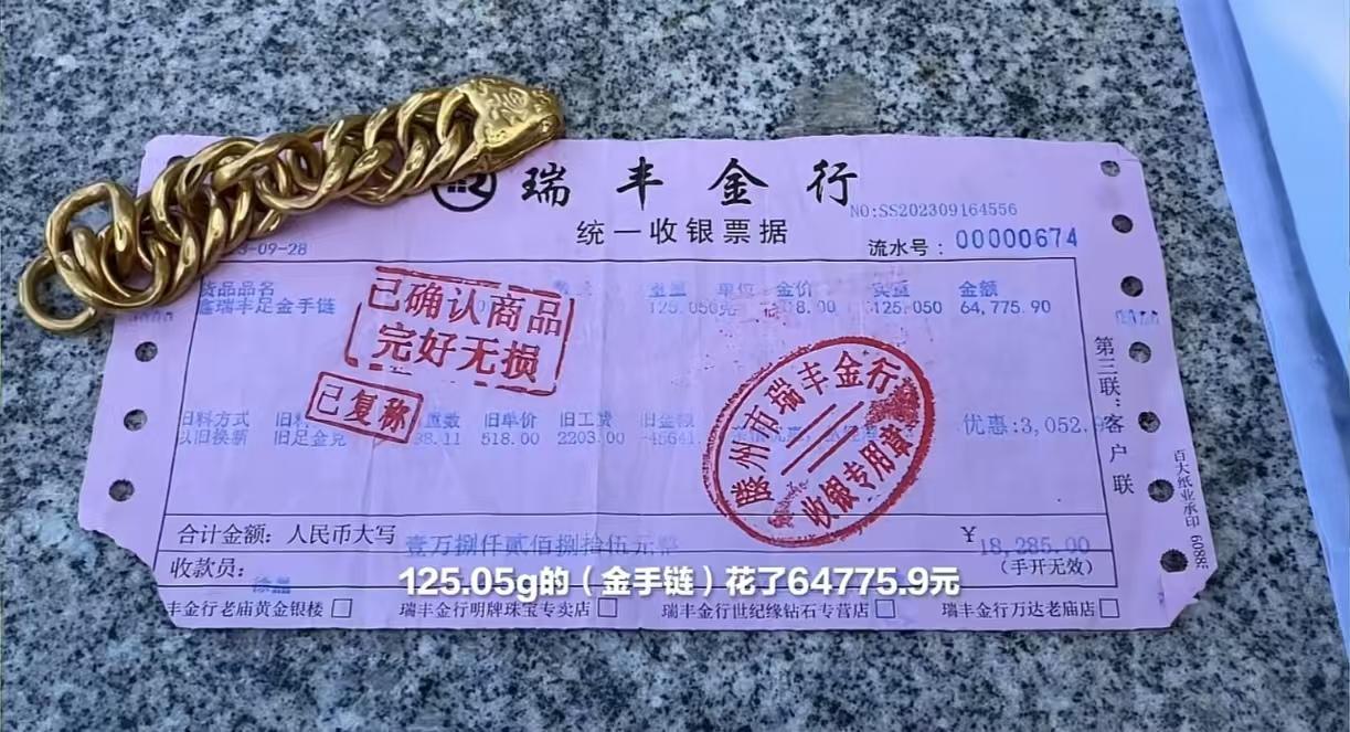 不破坏都不知道是假的!枣庄滕州,王先生在2023年给妻子买了一条125.05克的