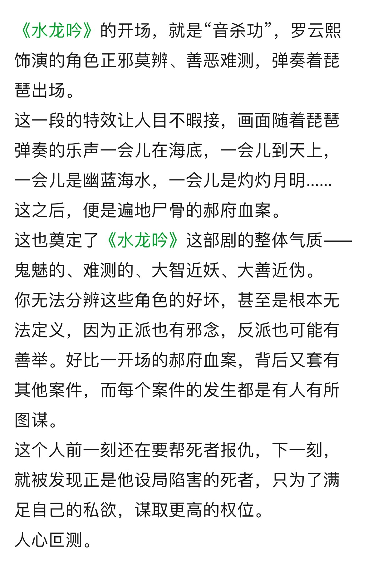 云合 水龙吟质感是真的可以,开场的罗云熙弹奏琵琶出现,古风阴湿味就拉满了。每个人物出场都有自己的个性特写和成长空间,尤其唐俪辞和柳眼这段古琴和琵琶合奏超级唯美,俊男美女好剧情是能追的下去水龙吟 水龙吟云合数据