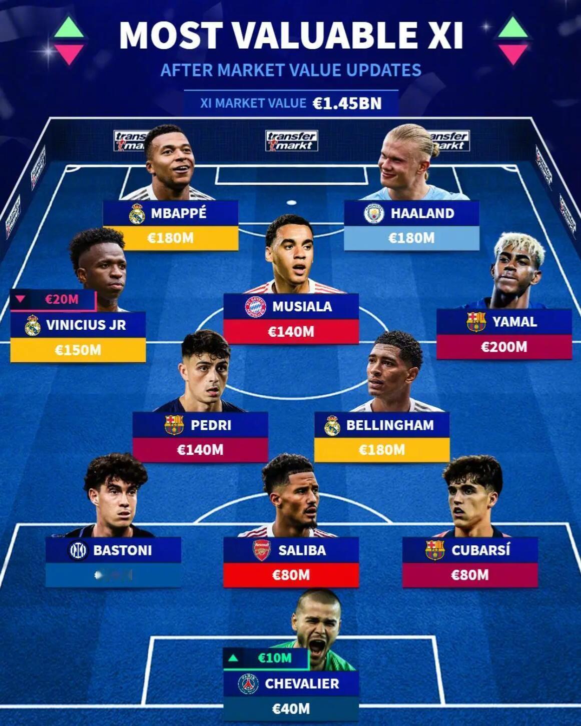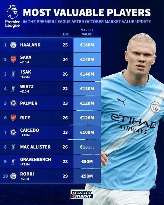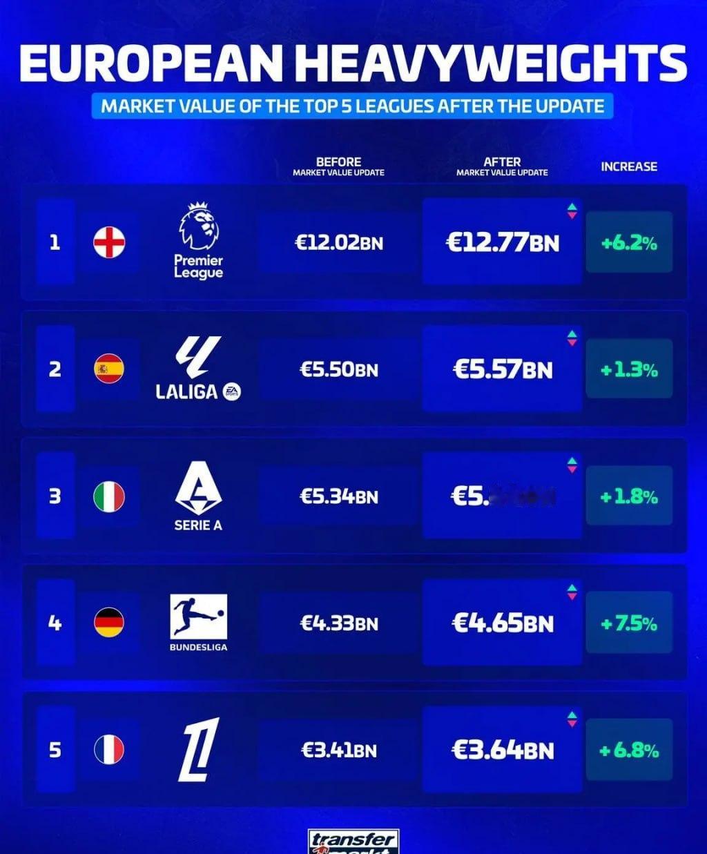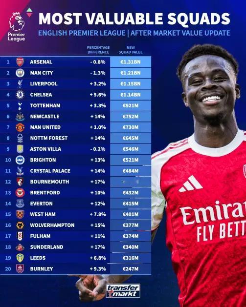 最新德转身价变化! ★五大联赛总身价排名! 英超以127.7亿欧断层领先,德甲涨幅最高。 ★目前足坛的最贵阵容! 11人阵容有6名来自皇马和巴萨。 ★球队总身价排行榜! 前20名中,英超占11席,西甲和意甲各3队,德甲2队,法甲1队。 ★20支英超球队总身价排行榜! 阿森纳现在是英超总身价最高的球队。 ★英超身价最高阵容! 阿森纳有5人入选。 ★英超球员身价TOP10! 哈兰德依然是英超身价最高的球员,切尔西中场凯塞多身价上涨1000万达到1亿欧元。 ★英超球员身价涨幅榜! 沃尔特马德+3500万欧居首,伊萨克+2000万欧次席,水晶宫中卫格伊身价涨至5000万欧,创职业生涯新高。 ★英超球员身价跌幅榜! 曼城中场罗德里,福登暴跌2000万欧,维尔茨也降了1000万。 ★身价最高中场球员榜单! 皇马的贝林厄姆以1.8亿欧居首。