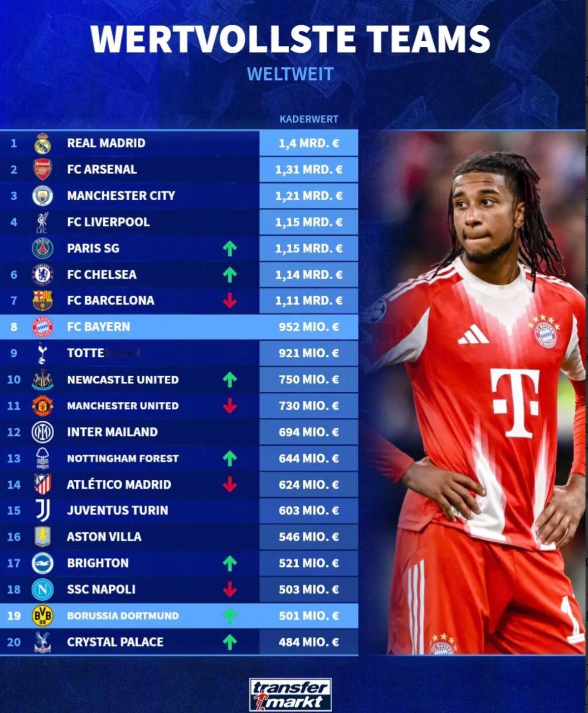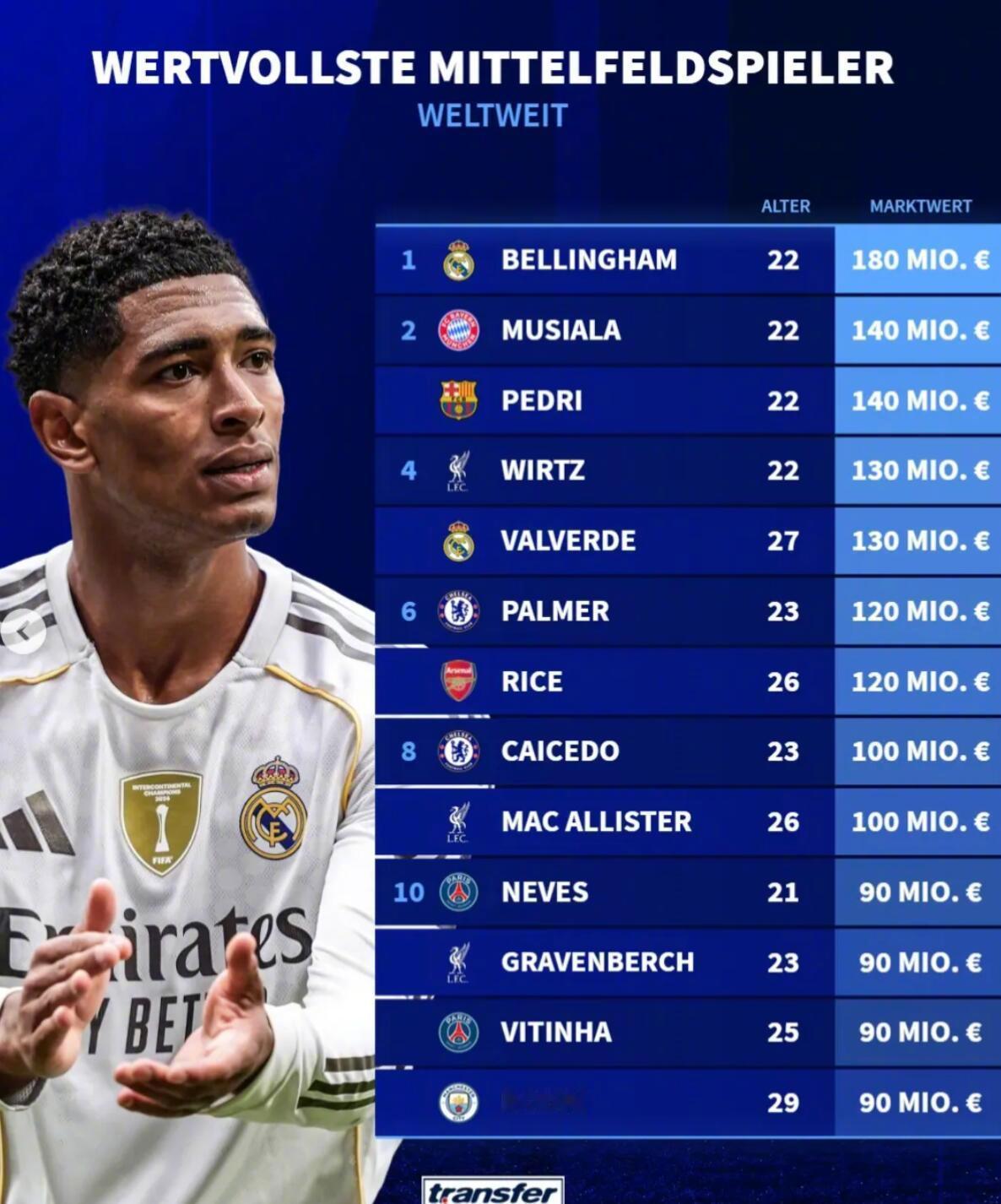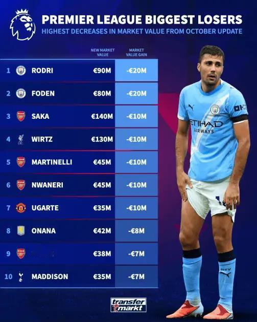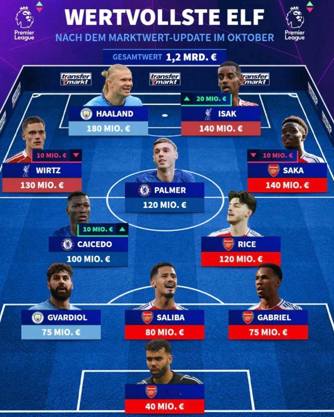 最新德转身价变化! ★五大联赛总身价排名! 英超以127.7亿欧断层领先,德甲涨幅最高。 ★目前足坛的最贵阵容! 11人阵容有6名来自皇马和巴萨。 ★球队总身价排行榜! 前20名中,英超占11席,西甲和意甲各3队,德甲2队,法甲1队。 ★20支英超球队总身价排行榜! 阿森纳现在是英超总身价最高的球队。 ★英超身价最高阵容! 阿森纳有5人入选。 ★英超球员身价TOP10! 哈兰德依然是英超身价最高的球员,切尔西中场凯塞多身价上涨1000万达到1亿欧元。 ★英超球员身价涨幅榜! 沃尔特马德+3500万欧居首,伊萨克+2000万欧次席,水晶宫中卫格伊身价涨至5000万欧,创职业生涯新高。 ★英超球员身价跌幅榜! 曼城中场罗德里,福登暴跌2000万欧,维尔茨也降了1000万。 ★身价最高中场球员榜单! 皇马的贝林厄姆以1.8亿欧居首。