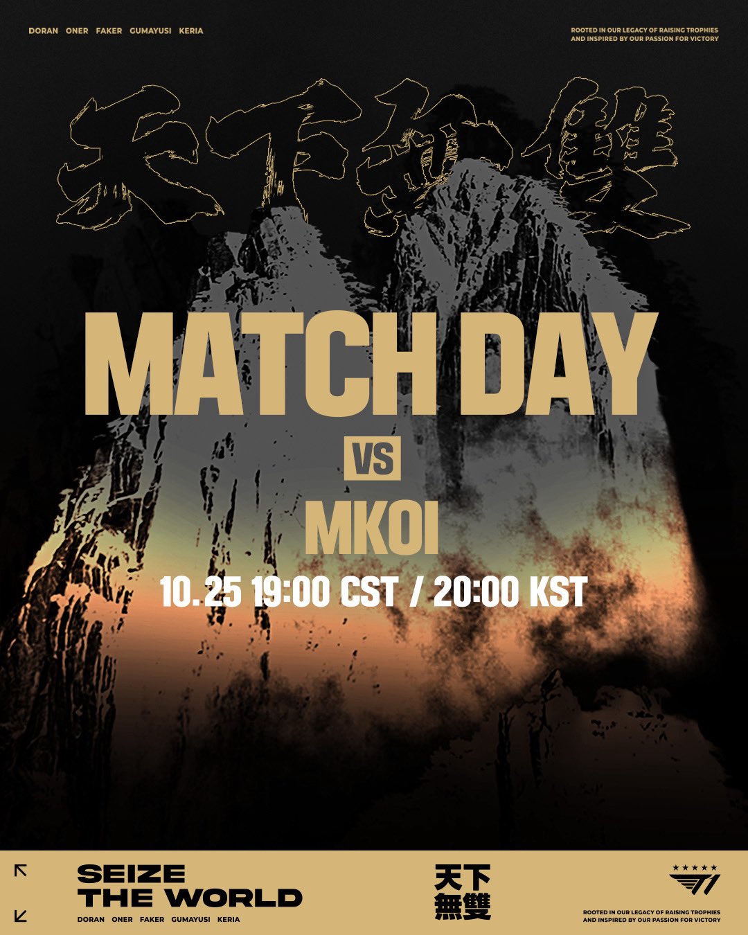 虎扑10月25日讯T1官媒发布赛前海报,并配文: