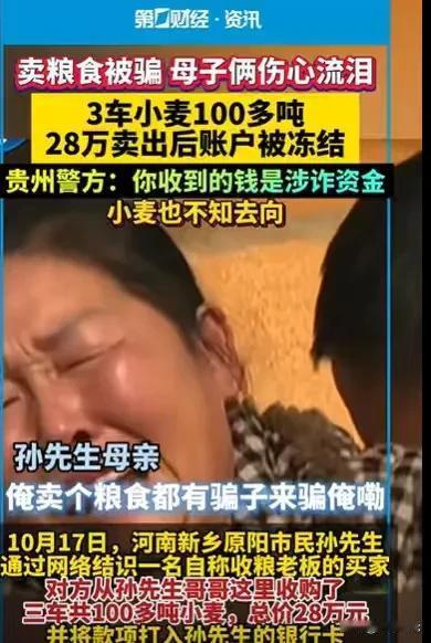 河南新乡,男子认识一个收粮食的买家,他看到哥哥家的小麦很多,就介绍给哥哥,哥哥就将3车小麦,一共100多吨,以28万的价钱卖了,这个人很快支付了小麦的钱,可一把小麦装车开走,就失联了,没过两天,男子和亲属的卡都被冻结了,那28万用不了了。 孙先生老母亲痛哭流涕,她没想到,儿子儿媳辛辛苦苦种出来的粮食,竟然还被别人给骗走了,她真的替儿子感到难过。 这一批麦子,是孙先生哥哥家的,孙先生哥哥和嫂子都是老实本分的小麦种植大户,今年他们收成非常好,足足收了100多吨的麦子,他们正想着,把小麦赶紧卖了,把贷款一还,剩余的就是今年的收入了。 小麦已经入仓,就等待有人来收粮食,他们也是四处打听,孙先生看着哥哥和嫂子种小麦不易,现在就差最后一步了,只要能把这些小麦卖了,哥哥嫂嫂肯定喜开颜笑。 孙先生闲来无事,也帮哥哥四处打听收小麦的人,他在网上就认识了一名收麦子的买家。 这个人告诉他,他就是收粮食的,孙先生觉得他给的价钱还算可以,就赶紧将这个人推荐给哥哥。 弟弟推荐的人,哥哥自然比较信任,哥哥也联系了这个买家。 他们谈好了小麦的价钱之后,买家就派人过来,一直看着,全程电话沟通, 他非常重视这一批小麦,一切也都很正常,孙先生和哥哥都没有察觉到这有什么问题。 孙先生的哥哥只想着赶紧把小麦卖了,他看到这个买家一下子就把他的小麦都要了,100多吨,一下子全部卖出去,可以得到28万,除去贷款种植小麦的钱,他们今年的收入确实很不错。 他看到买家派车过来装麦子了,内心无比激动,就赶紧帮忙装车,一袋又一袋的麦子,将车塞得满满的。 看着自己辛辛苦苦种植出来的小麦,终于流向需要它的地方,孙先生的哥哥感到非常有成就感。 而且这个老板真的很有效率,刚刚装好车,那28万就打到卡里来了。 奇怪的是,当小麦装好车,车离开了他们的视线之后,他们竟然联系不上这个买家了,他们感到非常困惑。 明明装车的时候还在联系,车一走就联系不上人了,他们觉得很蹊跷,却又想不出问题到底出现在哪里,毕竟那28万已经打到卡里来,他们已经实实在在地看到这一笔钱进了口袋了。 看到钱已经到位,孙先生和哥哥对此事并没有太在意,直到两天之后,孙先生的哥哥被告知,他卡里的28万已经被冻结了,这才下了大家一大跳。 大家都很困惑,他们卖小麦又不是什么违法的事情,为何他们的28万被冻结了,他们还要用这一笔钱,去还该还的贷款呢。 可现在,他们真的好无奈和懊恼,对于一个农民来说,这28万的收入,还不是他们一年的收入,除去成本,手里其实也没有多少钱。 辛辛苦苦一年,他们只是挣了一笔小小的辛苦费,到头来,这笔钱还用不了,他们都不知道生活该怎么过下去了。 他们赶紧报了警,想看看这到底是怎么回事,警方那边告诉他们,这28万是涉诈款,所以被冻结了。 如此一说,这28万有可能会被重新划扣给被诈骗的人,孙先生的哥哥将会一分钱不得,而那三车小麦,早已不见踪迹了。 更让他们想不明白的是,明明他们卖小麦是正常交易,他们怎么能知道别人来买小麦的钱是涉诈款呢,他们只是农民,只是想将自己辛辛苦苦种出来的粮食卖掉,碰到这样的事,难道就只能怪自己倒霉吗? 孙先生更是感到惭愧,他看着痛哭流涕的母亲,心疼儿子儿媳,孙先生更是过意不去。 如果他没有把这个买家推荐给哥哥,哥哥就不会受到任何损失。 如今事情已经发生,那么孙先生一家人该怎么办呢? 首先、买家用涉诈款来买这些小麦,他们明知道这28万将会被冻结的,他们还欺骗孙先生的哥哥,因此他们的行为构成了诈骗罪。 《刑法》第266条规定:诈骗公私财物,数额较大的,处三年以下有期徒刑、拘役或者管制,并处或者单处罚金;数额巨大或者有其他严重情节的,处三年以上十年以下有期徒刑,并处罚金;数额特别巨大或者有其他特别严重情节的,处十年以上有期徒刑或者无期徒刑,并处罚金或者没收财产。 具体到本事件当中,孙先生要追究责任,是应该找到买家,让他返还粮食的。 现在难就难在,粮食不见了,他们找不到了。 2、其次,这28万属于涉诈款,为了保护被诈骗的人的财产,是应该冻结的。 《反电信网络诈骗法》第20条及《公安机关办理刑事案件程序规定》,公安机关在侦查电信网络诈骗案件时,可依法对涉案账户采取紧急止付、快速冻结等措施,以阻断资金流转并保护受害人财产。 具体到实际中,如果这28万没有被冻结,那么被诈骗的人,他们的合法财产就受到了损失。 因此发生这样的事情,孙先生一家人就应该赶紧报警,尽快找回那三车小麦。 那么你认为孙先生和家人该怎么办呢?