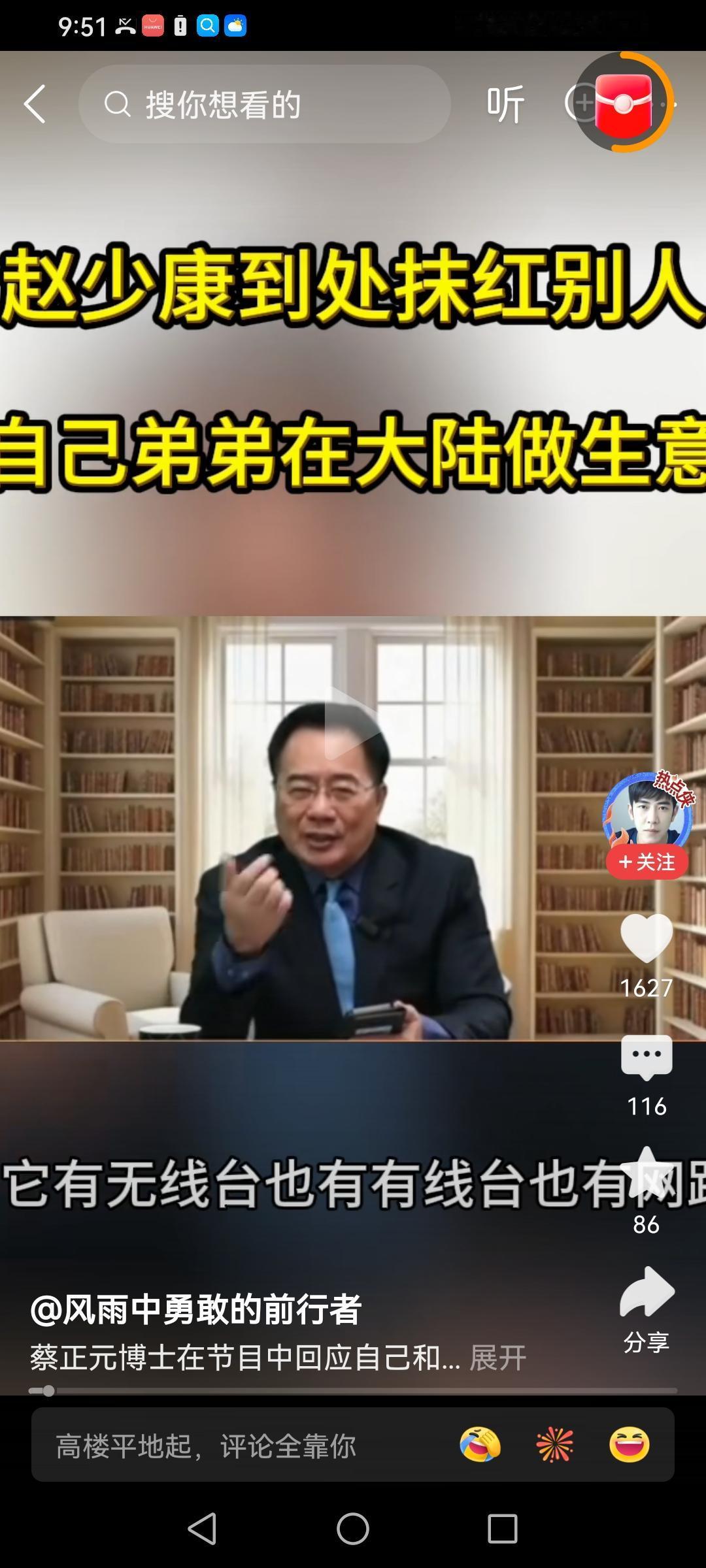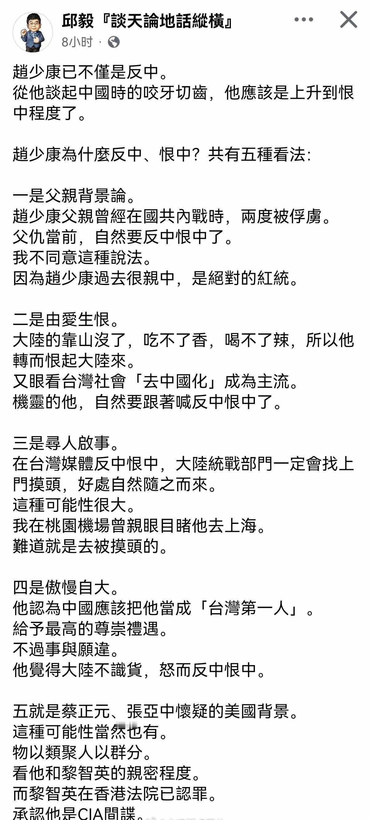 赵少康变成黎少康了! 赵少康要郑丽文清除国民党的亲中力量,赵少康恨大陆恨到骨子里了,他为什么这么恨大陆?有三个原因: 第一个:解放战争时期,他父亲被俘两次,在东北和海南岛。 第二个:跪美舔美,他曾留学美国,所以他看不起大陆。 第三个:他和黎Zhi英是铁哥们,黎Zhi英现在是阶下囚。 赵少康主持的节目《少康战情室》,这个节目的老板是王雪红,王雪红在大陆有巨大的投资,赵少康的弟弟也在大陆有投资。赵少康一边享受大陆带来的福利,他就是吃肉砸锅的恶棍。