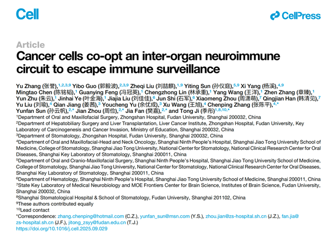 复旦大学附属中山医院季彤教授、樊嘉院士、周俭教授、孙云帆教授及上海交通大学医学院附属第九人民医院张陈平教授为本文通讯作者。复旦大学附属中山医院“卓越住院医师”临床博士后张誉博士、郭毅波博士、复旦大学附属中山医院口腔颌面外科刘喆麒博士、上海交通大学医学院附属第九人民医院孙仪庭博士及杨溪主任医师为本文共同第一作者。中国科学院脑科学与智能技术卓越创新中心蒲慕明院士为本研究提供特别支持。