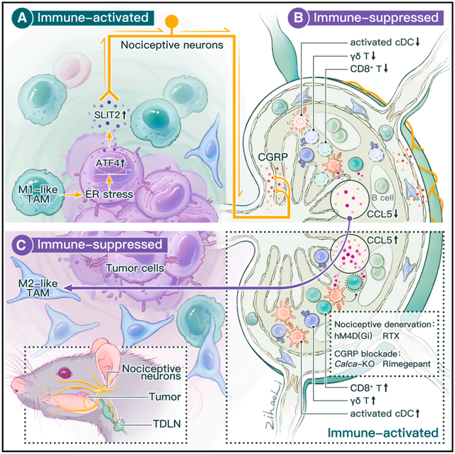 本研究从两个头颈鳞状细胞癌的临床队列出发,发现肿瘤组织中感觉神经富集,且高感觉神经丰度与患者更强的术前疼痛相关。通过单细胞转录组、空间转录组等技术,发现高感觉神经丰度促进患者肿瘤组织及外周血中的抑制性免疫景观。其中尤为显著的是:肿瘤相关巨噬细胞(TAM)与感觉神经在肿瘤组织中空间毗邻。通过多种小鼠模型与患者肿瘤组织验证,研究人员发现:肿瘤组织中受到TAM压力的肿瘤细胞可以通过ATF4介导的SLIT2分泌激活支配肿瘤的感觉神经,并产生疼痛。
