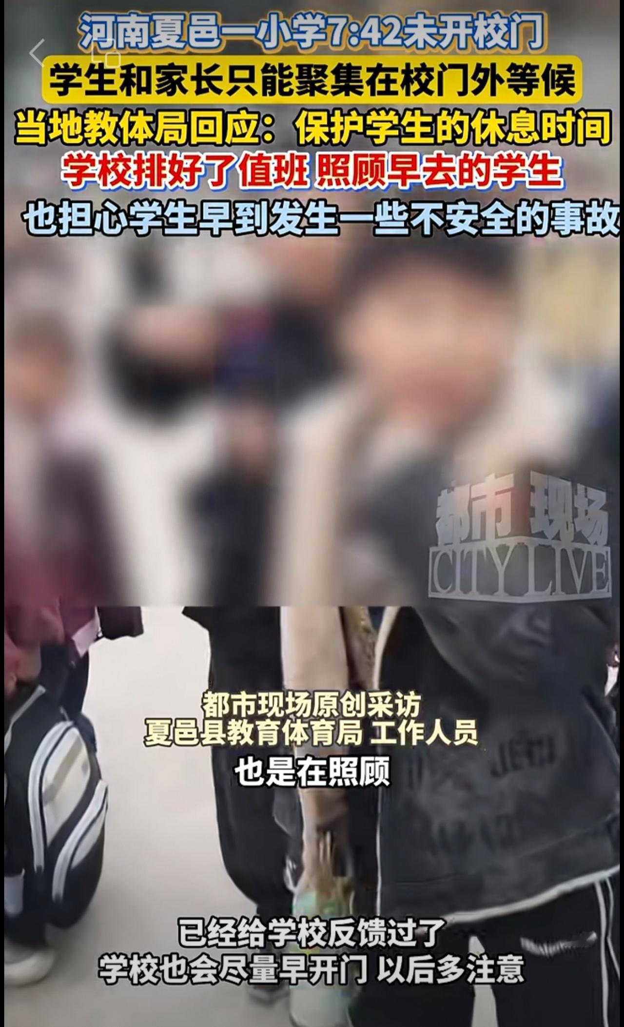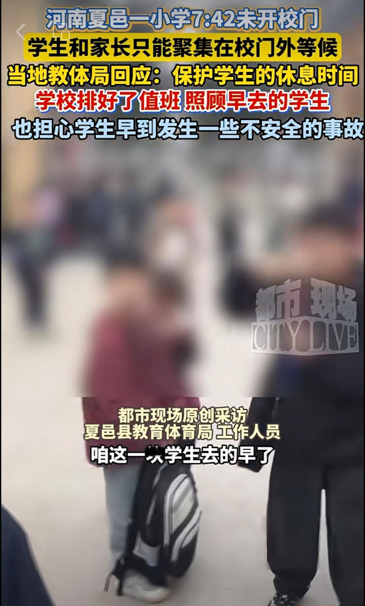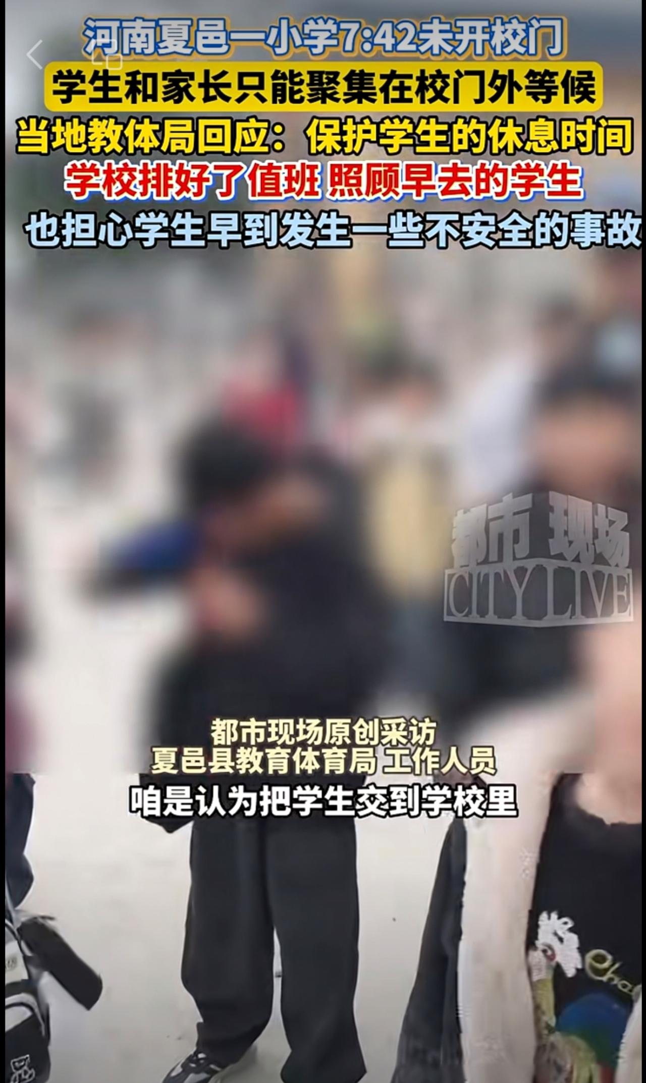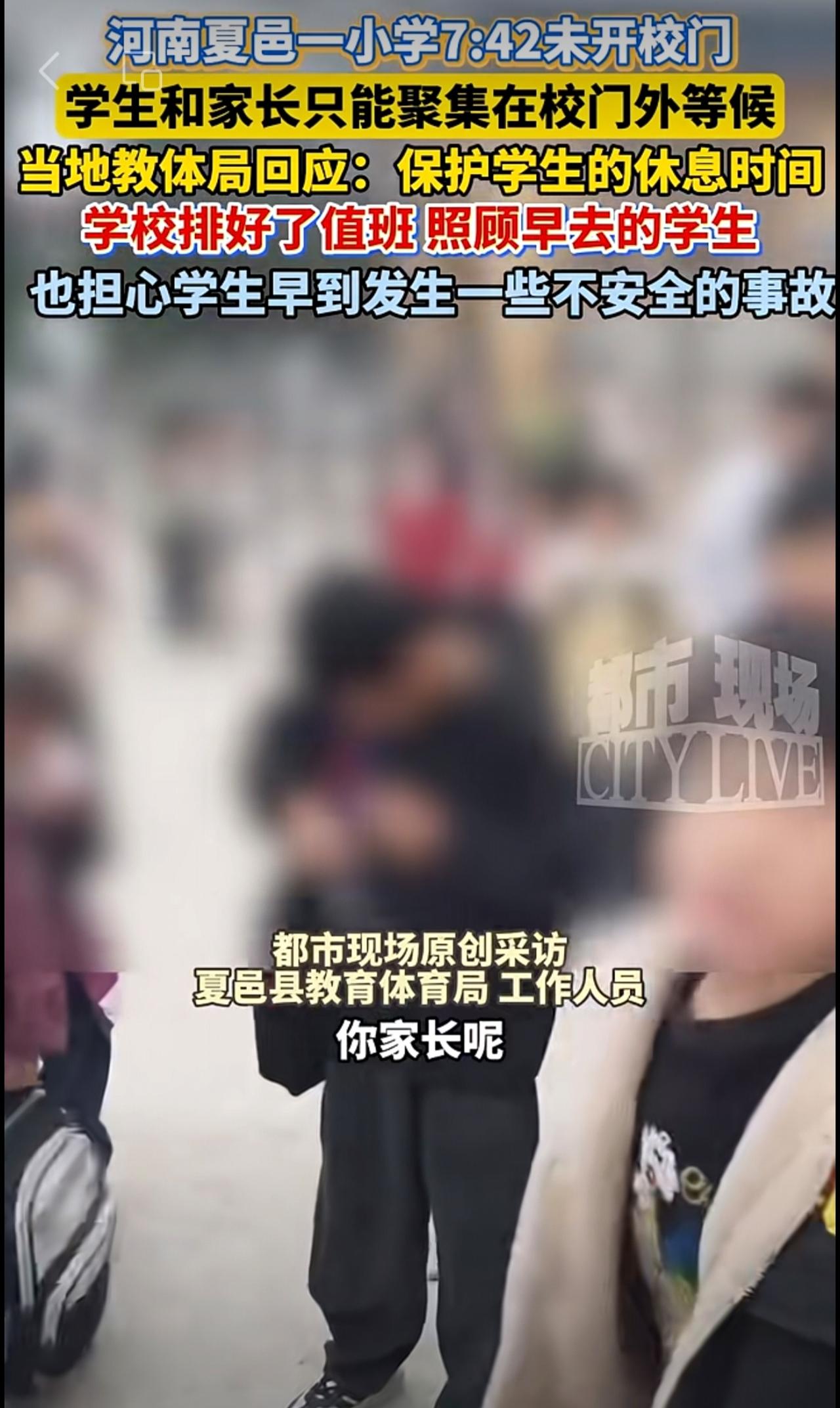 河南夏邑一小学7:42未开校门,学生和家长只能聚集在校门外等候。当地教体局回应: