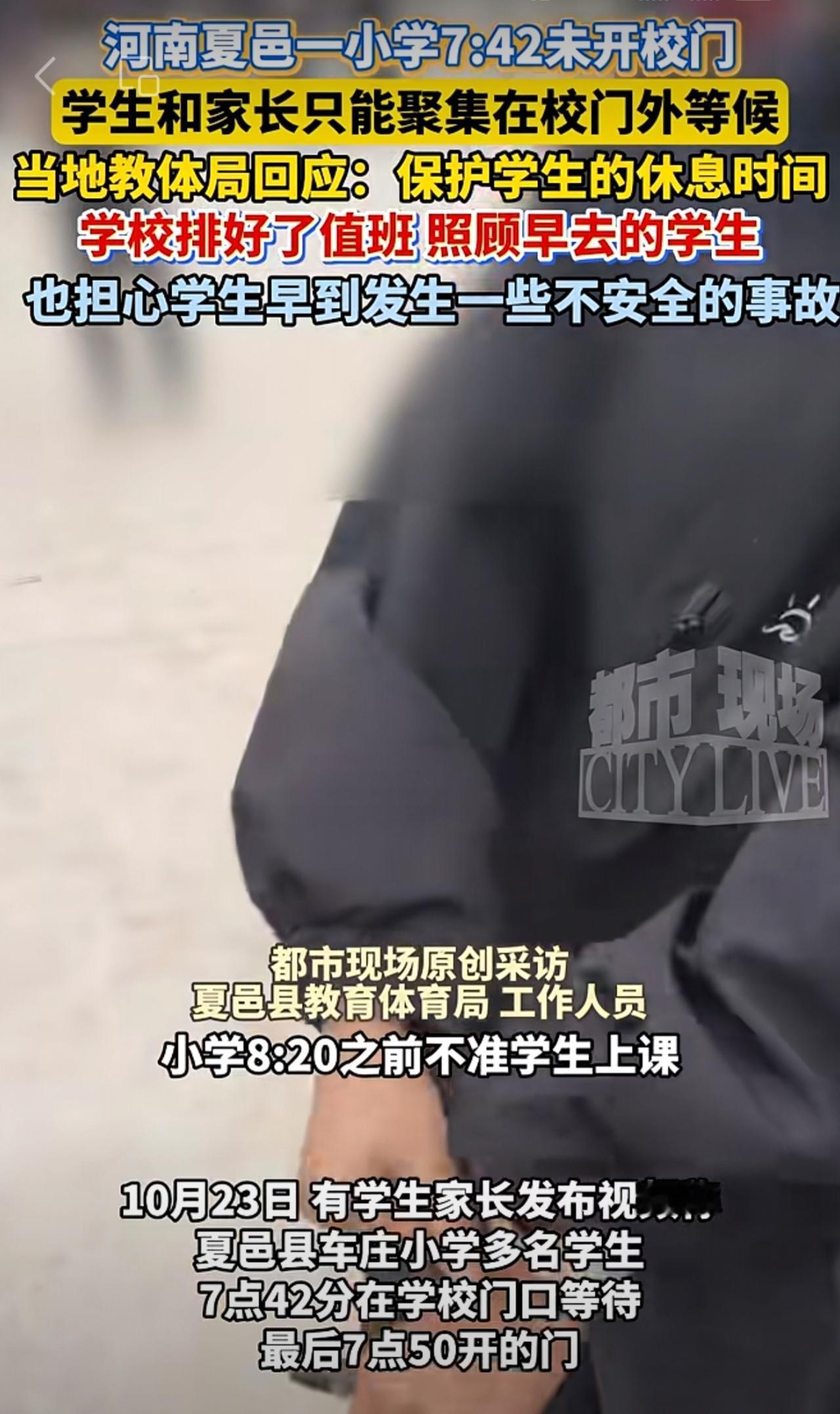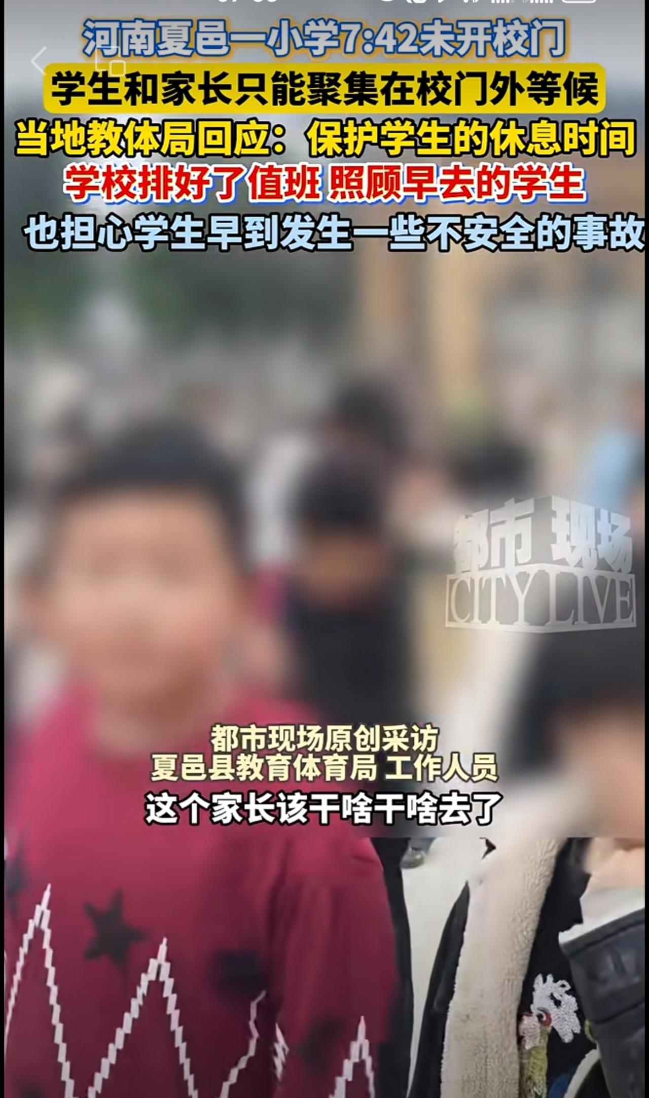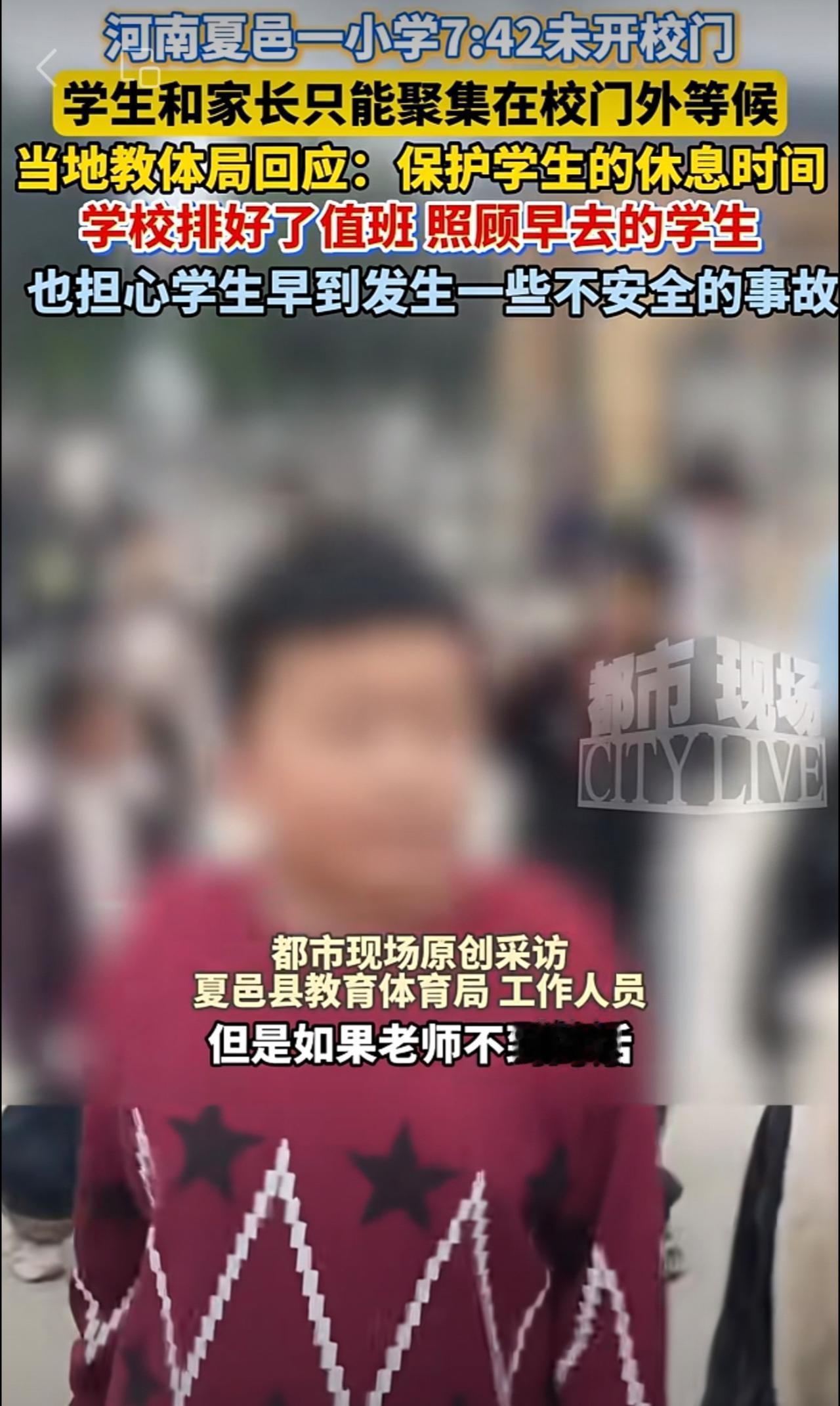 河南夏邑一小学7:42未开校门,学生和家长只能聚集在校门外等候。当地教体局回应: